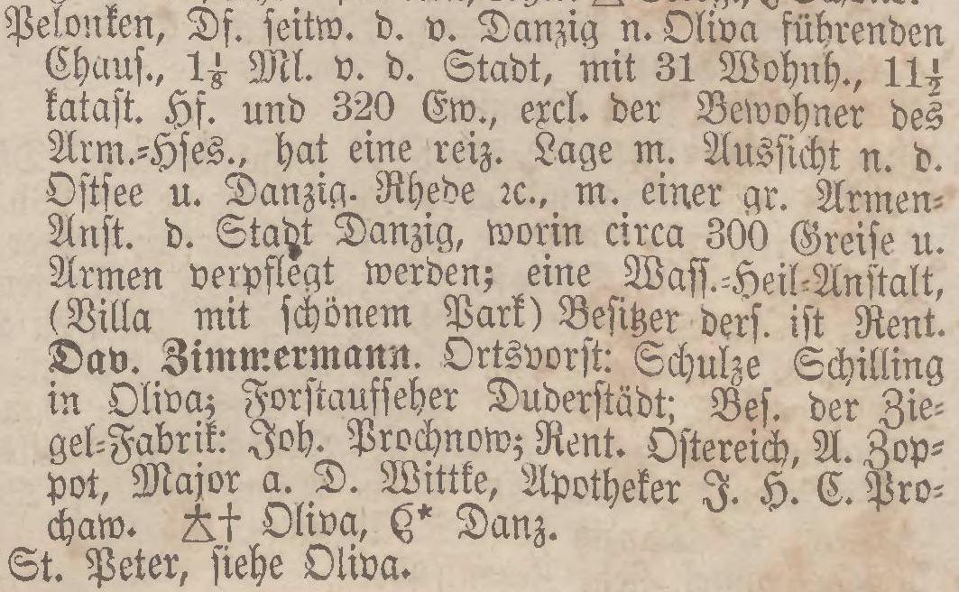 Pelonken, Df. seitw. d. v. Danzig n. Oliva führenden Chaus., 1 1/8. Ml. v. d. Stadt, mit 31 Wohnh., 11 1/2 katast. Hf. und 320 Ew., excl. der Bewohner des Arm.-Hses., hat eine reiz. Lage m. Aussicht n. d. Ostsee u. Danzig. Rhede Amt., m. einer gr. Armen- Anst. d. Stadt Danzig, worin circa 300 Greise u. Armen verpflegt werden; eine Wass.-Heil-Anstalt, (Villa mit schönem Park) Besizer ders. ist Rent. Dav. Zimmermann. Ortsvorst: Schulze Schilling in Oliva; Forstaufseher Duderstädt; Bes. der Ziegel-Fabrik: Joh. Prochnow; Rent. Ostereich, A. Zoppot, Major a. D. Wittke, Apotheker J. H. C. Prochaw. Evang. Kirche, kathol. Kirche Oliva, Post-Erpedition Danzig.