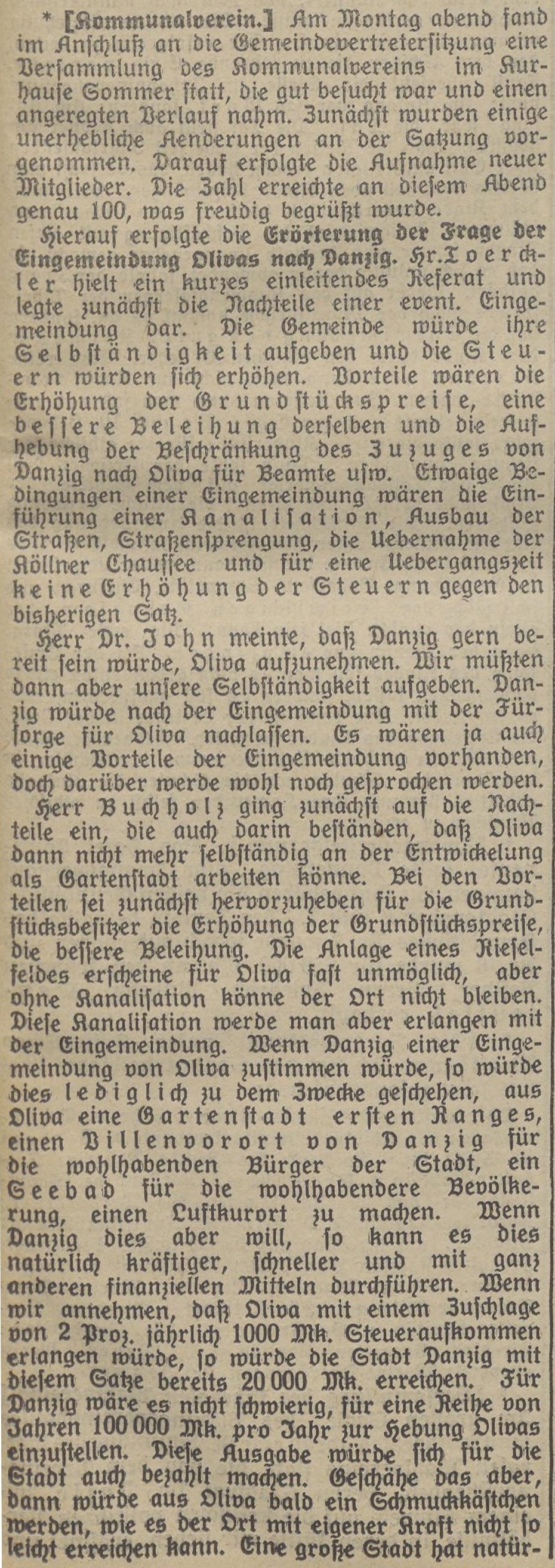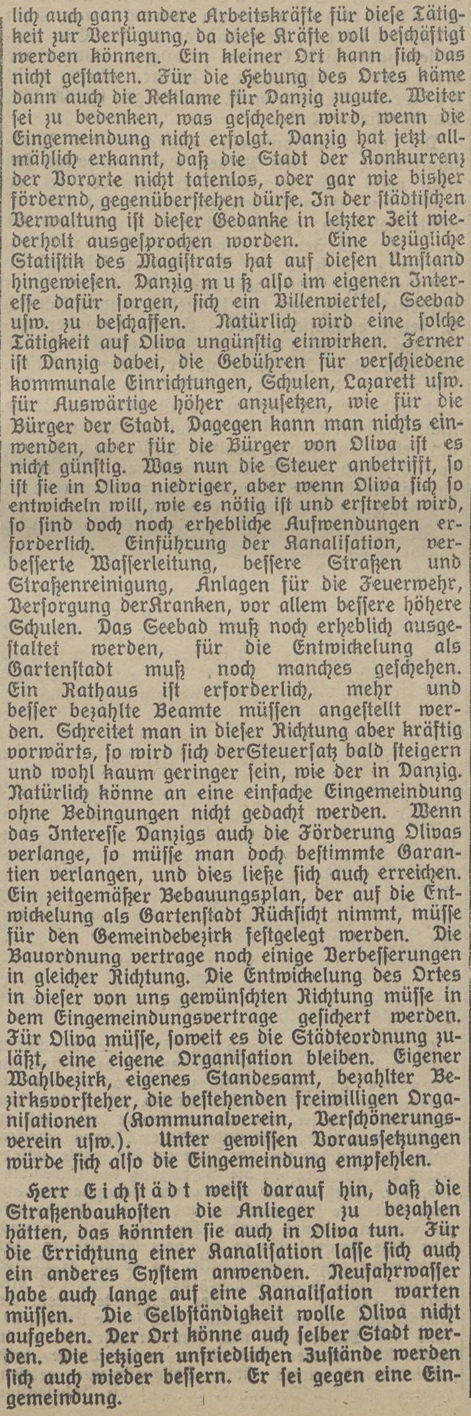 Następnie odbyła się dyskusja na temat przyłączenia Oliwy do Gdańska. Pan Toerckler wygłosił krótkie przemówienie wprowadzające i najpierw wyjaśnił wady ewentualnej inkorporacji. Gmina zrezygnowałaby ze swojej niezależności, a podatki by wzrosły. Korzyścią byłby wzrost cen gruntów, lepsze ich zabezpieczenie hipoteczne, zniesienie ograniczeń dla urzędników przenoszących się z Gdańska do Oliwy itp. Możliwymi warunkami przyłączenia byłoby wprowadzenie kanalizacji, rozbudowa dróg, wybrukowanie dróg, przejęcie Köllner Chaussee oraz w okresie przejściowym niepodnoszenie podatków w stosunku do poprzedniej stawki.