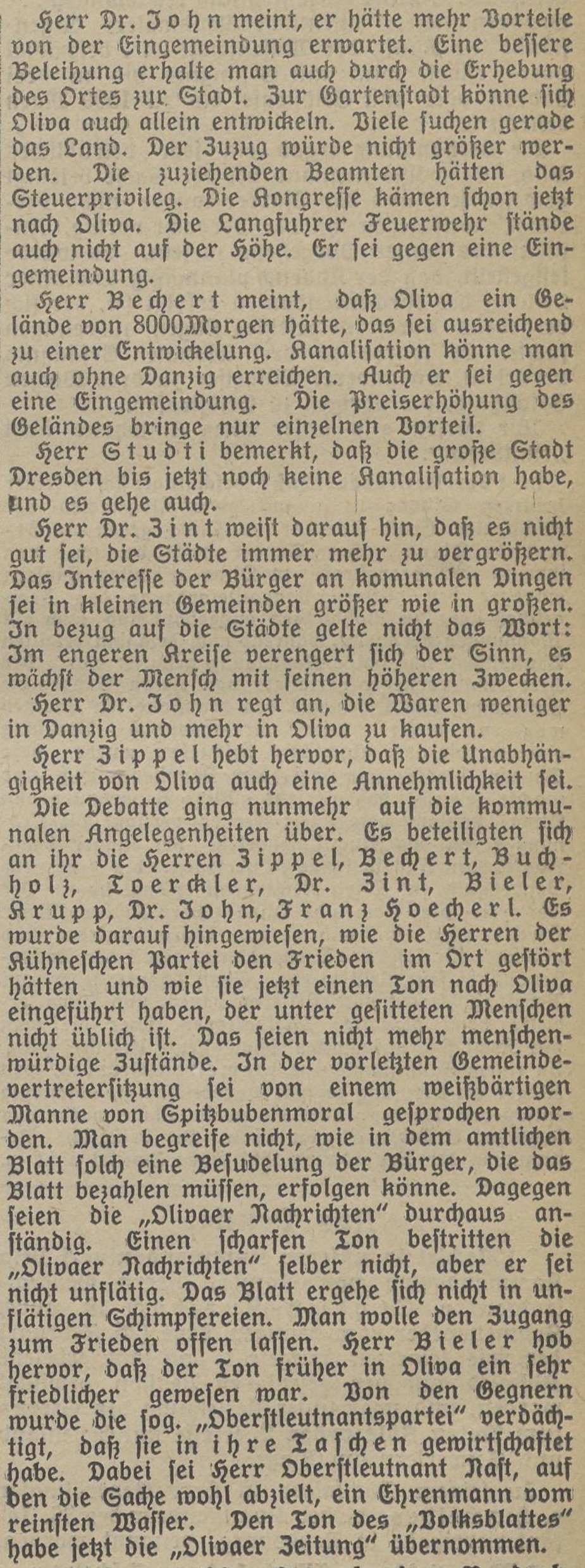 meinte, daß Danzig gern bereit fein würde, Oliva aufzunehmen. Wir müßten dann aber unsere Selbständigkeit aufgeben. Danzig würde nach der Eingemeindung mit der Fürforge für Oliva nachlassen. Es wären ja auch einige Vorteile der Eingemeindung vorhanden, doch darüber werbe wohl noch gesprochen werden.