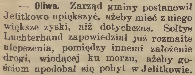 Droga do Jelitkowa ›![]() "Gazeta Gdańska", na wtorek 9-go marca 1909 r.: - Oliwa. Zarząd gminy postanowił Jelitkowo upiększyć, ażeby mieć z niego większe zyski, niż dotychczas. Sołtys Luchterhard zapowiedział już rozmaite ulepszenia, pomiędzy innemi założenie drogi, wiodącej ku morzu, ażeby gościom upodobał się pobyt w Jelitkowie. ![]()