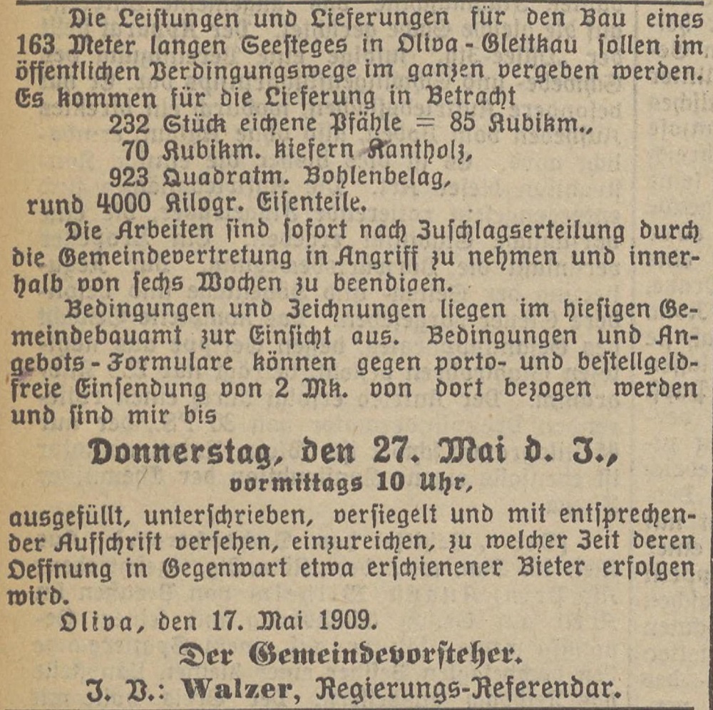 Die Leistungen und Lieferungen für den Bau eines 163 Meter langen Seesteges in Oliva - Glettkau sollen im öffentlichen Verdingungswege im ganzen vergeben werden.