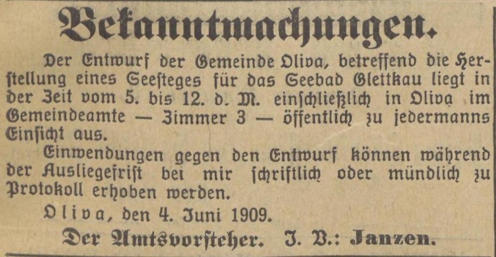 Der Entwurf der Gemeinde Oliva, betreffend die Herstellung eines Seesteges für das Seebad Glettkau liegt in der Zeit vom 5. bis 12. d. M. einschließlich in Oliva im Gemeindeamte - Zimmer 3 - öffentlich zu jedermanns Einsicht aus.