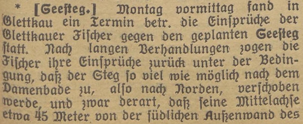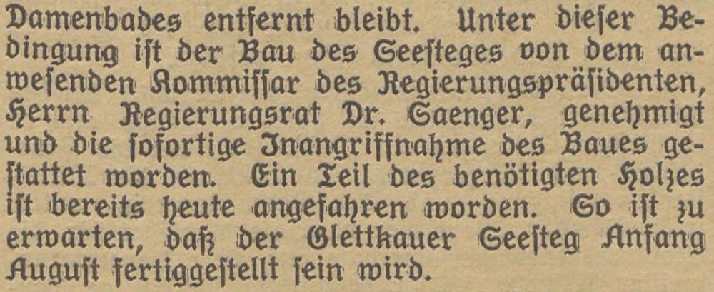 * [Seesteg.] Montag pormittag fand in Glettkau ein Termin betr. die Einsprüche der Glettkauer Fischer gegen den geplanten Seesteg statt. Nach langen Verhandlungen zogen die Fischer ihre Einsprüche zurück unter der Bedingung, dass der Steg so viel wie möglich nach dem Damenbade zu, also nach Norden, verschoben werde, und zwar derart, daß feine Mittelachje etwa 45 Meter pon der jüdlichen Außenmand des Damenbades entfernt bleibt. Unter dieser Bedingung ist der Bau des Seesteges von dem anwesenden Kommissar des Regierungspräsidenten, Herrn Regierungsrat Dr. Saenger, genehmigt und die sofortige Inangriffnahme des Baues gestattet worden. Ein Teil des benötigten Holzes ist bereits heute angefahren worden. Go ist zu erwarten, daß der Glettkauer Geesteg Anfang August fertiggejtelit Tein wird.