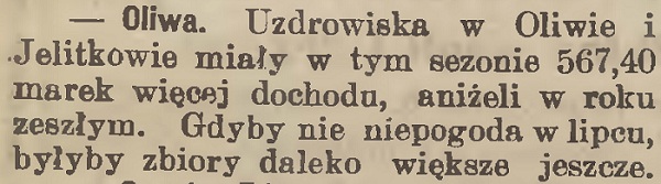 - Oliwa. Uzdrowiska w Oliwie i Jelitkowie miały w tym sezonie 567,40 marek więcej dochodu, aniżeli w roku zeszłym. Gdyby nie niepogoda w lipcu, byłyby zbiory daleko większe jeszcze.