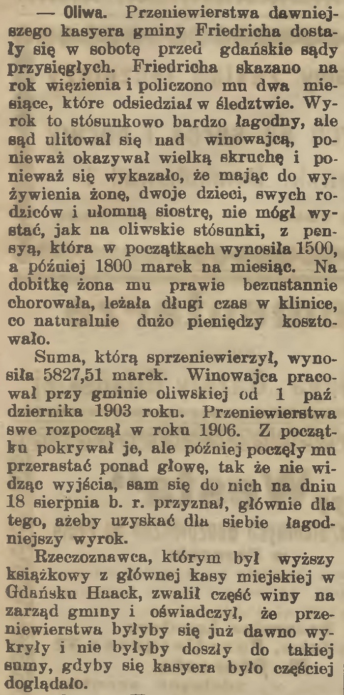 — Oliwa. Przeniewierstwa dawniejszego kasyera gminy Friedricha dostały się w sobotę przed gdańskie sądy przysięgłych. Friedricha skazano na rok więzienia i policzono mu dwa miesiące, które odsiedział w śledztwie. Wyrok to stosunkowo bardzo łagodny, ale sąd ulitował się nad winowajcą, ponieważ okazywał wielką skruchę i ponieważ się wykazało, że mając do wyżywienia żonę, dwoje dzieci, swych rodziców i ułomną siostrę, nie mógł wystać, jak na oliwskie stósunki, z pensyą, która w początkach wynosiła 1500, a później 1800 marek na miesiąc. Na dobitkę żona mu prawie bezustannie chorowała, leżała długi czas w klinice, co naturalnie dużo pieniędzy kosztowało.