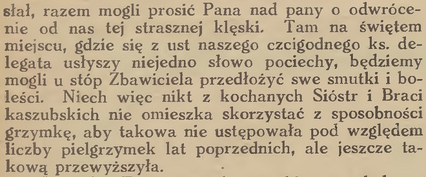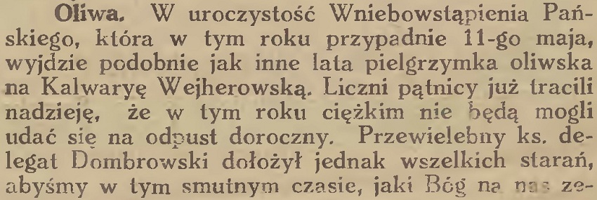 Pielgrzynka ›![]() "Gazeta Gdańska", sobota 27-go marca 1915 r.: Oliwa. W uroczystości Wniebowstąpienia Pańskiego, która w tym roku przypadnie 11-go maja, wyjdzie podobnie jak inne lata pielgrzymka oliwska na Kalwarię wejherowską. Liczni pątnicy już tracili nadzieję, że w tym roku ciężkim {I wojna światowa} nie będą mogli udać się na odpust doroczny. Przewielebny ks. delegat Dombrowski dołożył jednak wszelkich starań, abyśmy w tym smutnym czasie, jaki Bóg na nas zesłał, razem mogli prosić Pana nad pany o odwrócenie od nas tej strasznej klęski. Tam na świętym miejscu, gdzie się z ust naszego czcigodnego ks. delegata usłyszy niejedno słowo pociechy, będziemy mogli u stóp Zbawiciela przedłożyć swe smutki i boleści. Niech więc nikt z kochanych Sióstr i Braci kaszubskich nie omieszka skorzystać z sposobności grzymkę, aby takowa nie ustępowała pod względem liczby pielgrzymek lat poprzednich, ale jeszcze takową przewyższała. ![]() ![]()