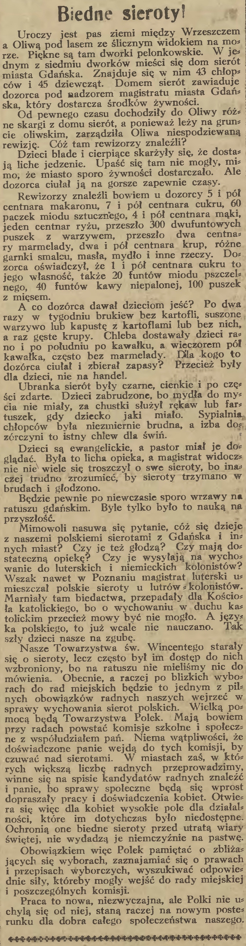Nasze Towarzystwa św. Wincentego starały się o sieroty, lecz często był im dostęp do nich wzbroniony, bo na ratuszu nie mieliśmy nic do mówienia. Obecnie, a raczej po blizkich wyborach do rad miejskich będzie to jednym z pilnych obowiązków radnych naszych wejrzeć w sprawy wychowania sierot polskich. Wielką pomocą będą Towarzystwa Polek. Mają bowiem przy radach powstać komisje szkolne i społeczne z współudziałem pań. Niema wątpliwości, że doświadczone panie wejdą do tych komisji, by czuwać nad sierotami. W miastach zaś, w których większą liczbę radnych przeprowadzimy, winne się na spisie kandydatów radnych znaleźć i panie, bo sprawy społeczne będą się wprost dopraszały pracy i doświadczenia kobiet. Otwiera się więc dla kobiet wysokie pole dla działalności, które im dotychczas było niedostępne. Ochronią one biedne sieroty przed utratą wiary świętej, nie wydadzą je niemczyźnie na pastwę.