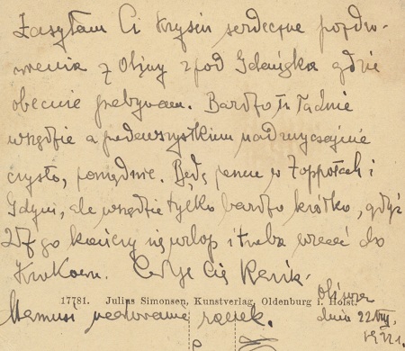 „Zasyłam Ci Krysiu serdeczne pozdrowienia z Oliwy z pod Gdańska gdzie obecnie przebywam. Bardzo tu ładnie wszędzie a przede wszystkim nadzwyczajnie czysto, porządnie. Będę jeszcze w Sopotach i Gdańsku, ale wszędzie tylko bardzo krótko, gdyż 25-tego kończy się urlop i trzeba wracać do Krakowa ...