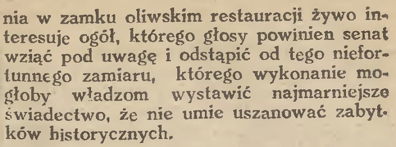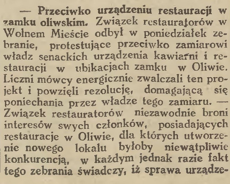 – Przeciwko urządzeniu restauracji w zamku oliwskim [Pałacu Opatów]. Związek restauratorów w Wolnym Mieście odbył w poniedziałek zebranie, protestujące przeciwko zamiarowi władz senackich urządzenia kawiarni w restauracji w ubikacjach zamku w Oliwie. Liczni mówcy energicznie zwalczali ten projekt i powzięli rezolucję, domagającą się poniechania przez władze tego zamiaru. – Związek restauratorów niezawodnie broni interesów swoich członków, posiadających restaurację w Oliwie, dla których utworzenie nowego lokalu byłoby niewątpliwie konkurencją, w każdym jednak razie fakt tego zebrania świadczy, iż sprawa urządzenia w zamku oliwskim restauracji żywo interesuje ogół, którego głosy powinie senat wziąć pod uwagę i odstąpić od tego niefortunnego zamiaru, którego wykonanie mogłoby władzom wystawić najmarniejsze świadectwo, że nie umie uszanować zabytków historycznych.