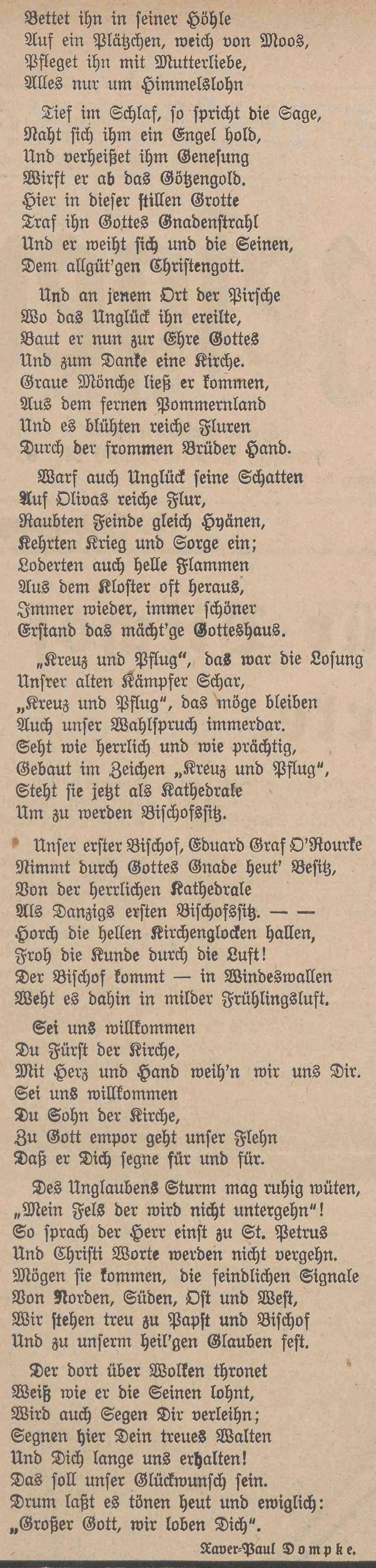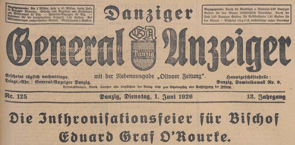 Podczas uroczystej ceremonii, która odbyła się dziś, pierwszy biskup Gdańska, hrabia Eduard O'Rourke, objął diecezję. W pierwszych dniach stycznia z Rzymu nadeszła wiadomość, że papież podniósł terytorium Wolnego Miasta Gdańska do rangi odrębnej diecezji, bezpośrednio podległej Stolicy Apostolskiej, a jednocześnie mianował poprzedniego administratora apostolskiego, biskupa hrabiego O'Rourke, który pełnił tam już czteroletnią posługę, pasterzem Gdańska. Wiadomość ta została przyjęta z wielką radością przez katolików Wolnego Państwa, a wierni ze wszystkich stron Wolnego Państwa Gdańska i okolic zgromadzili się dziś w Gdańsku, aby uczcić uroczystą intronizację pierwszego biskupa – dzień tak pamiętny dla gdańskiego Kościoła katolickiego. Pierwsi uczestnicy przybyli do Oliwy wczesnym rankiem, a kolej państwowa, tramwaje i autobusy były w stanie poradzić sobie z ogromnym napływem wiernych. Szkoły i kluby zgromadziły się na Georgstraße, z czołem procesji zwróconym w stronę Danziger Straße, podczas gdy dostojni goście i korpus dyplomatyczny udali się do katedry, a komitet uroczystości zebrał się przed Domem Łazarza na rogu Danziger Straße i ogrodów zamkowych. O godzinie 10:00 Najczcigodniejszy Biskup przyjechał do Oliwy samochodem z Gdańska i został powitany w Domu Łazarza przez prałata Migra Berendta przemówieniem. Po nałożeniu odświętnych szat liturgicznych w kaplicy Domu Łazarza, procesja, prowadzona przez Orkiestrę Stieberitów i przy dźwiękach dzwonów, przemaszerowała z około 80 flagami.
