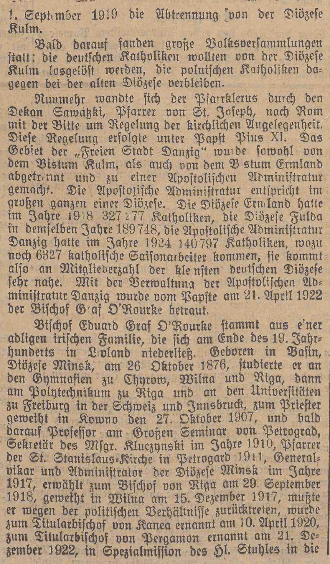 Nunmehr wandte sich der Pfarrklerus durch den Dekan Sawazki, Pfarrer von St. Joseph, nach Rom mit der Bitte um Regelung der kirchlichen Angelegenheit. Diese Regelung erfolgte unter Papst Pius XI. Das Gebiet der Freien Stadt Danzig" wurde sowohl von dem Bistum Kulm, als auch von dem B stum Ermland abgetrennt und zu einer Apostolischen Administratur gemacht. Die Apostolische Administratur entspricht im großen ganzen einer Diözese. Die Diözese Ermland hatte im Jahre 1918 32777 Katholiken, die Diözese Fulda in demselben Jahre 189748, die Apostolische Administratur Danzig hatte im Jahre 1924 140797 Katholiken, wozu noch 6 327 katholische Saisonarbeiter kommen, sie kommt also an Mitgliederzahl der kle nsten deutschen Diözese sehr nahe. Mit der Verwaltung der Apostolischen Ad- ministratur Danzig wurde vom Papste am 21. April 1922 der Bischof Graf O'Rourke betraut.