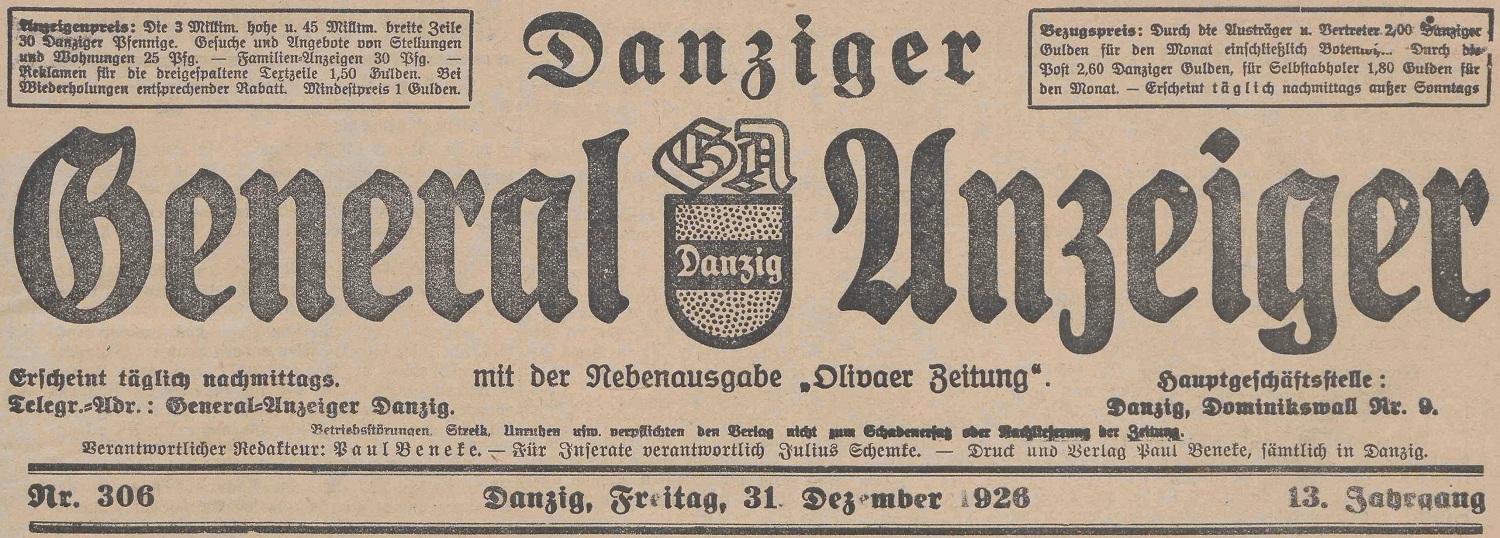 Danziger General - Anzeiger mit der "Olivaer Zeitung" nr 306 z 31. 12. 1926 ›