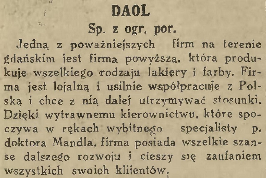 Jedną z poważniejszych firm na terenie gdańskim jest firma powyższa, która produkuje wszelkiego rodzaju lakiery i farby. Firma jest lojalną i usilnie współpracuje z Polską i chce z nią dale| utrzymywać stosunki. Dzięki wytrawnemu kierownictwu, które spoczywa w rękach wybitnego specjalisty p. doktora Mandla, firma posiada wszelkie szanse dalszego rozwoju i cieszy się zaufaniem wszystkich swoich klijentów.