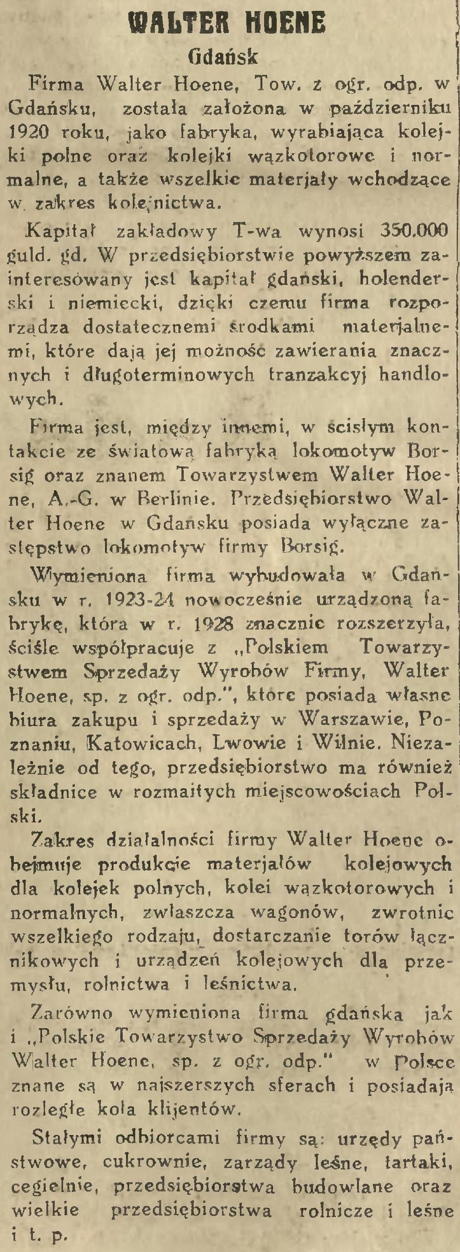 Firma Walter Hoene, Tow. z ogr. odp. w Gdańsku, została założona w październiku 1920 roku, jako fabryka, wyrabiająca kolejki polne oraz kolejki wązkotorowe i normalne, a także wszelkie materjały wchodzące w. zakres kolejnictwa.
