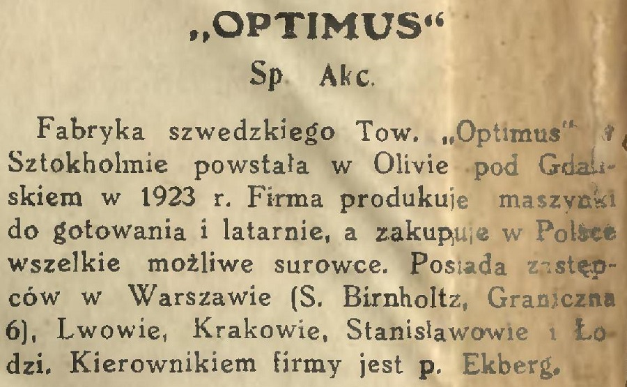 Fabryka szwedzkiego Tow. "Optimus" w Sztokholmie powstała w Olivie poo Gdańskiem w 1923 r. Firma produkuje maszynki do gotowania i latarnie, a zakupuje Polsce wszelkie możliwe surowce. Posada zastępców w Warszawie (S. Birnholtz, Graniczna 6), Lwowie, Krakowie, Stanisławowie i Łodzi. Kierownikiem firmy jest p. Ekberg.