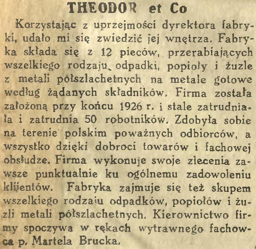 Korzystając z uprzejmości dyrektora fabryki, udało mi się zwiedzić jej wnętrza. Fabryka składa się z 12 pieców, przerabiających wszelkiego rodzaju, odpadki, popioły i żule z metali półszlachetnych na metale gotowe według żądanych składników. Firma została założoną przy końcu 1926 r. i stale zatrudniała i zatrudnia 50 robotników. Zdobyła sobie na terenie polskim poważnych odbiorców, a wszystko dzięki dobroci towarów i fachowej obsłudze. Firma wykonuje swoje zlecenia zawsze punktualnie ku ogólnemu zadowoleniu klijentów. Fabryka zajmuje się też skupem wszelkiego rodzaju odpadków, popiołów i żużli metali półszlachetnych. Kierownictwo firmy spoczywa w rękach wytrawnego fachowca p. Martela Brucka.