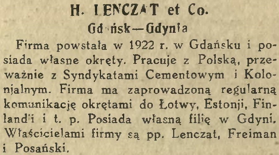 Firma powstała w 1922 r. w Gdańsku i posiada własne okręty. Pracuje z Polską, przeważnie z Syndykatami Cementowym i Kolonialnym. Firma ma zaprowadzoną regularną komunikację okrętami do Łotwy, Estonji, Finlandji i t. p. Posiada własną filię w Gdyni. Właścicielami firmy są pp. Lenczat, Freiman i Posański.