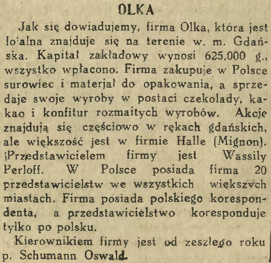 Jak się dowiadujemy, firma Olka, która jest lojalna znajduje się na terenie w. m. Gdańska. Kapitał zakładowy wynosi 625,000 g., wszystko wpłacono. Firma zakupuje w Polsce surowiec i materjał do opakowania, a sprzedaje swoje wyroby w postaci czekolady, kakao i konfitur rozmaitych wyrobów. Akcje znajdują się częściowo w rękach gdańskich, ale większość jest w firmie Halle (Mignon). Przedstawicielem firmy jest Wassily Perloff. W Polsce posiada firma 20 przedstawicielstw we wszystkich większych miastach. Firma posiada polskiego korespondenta, a przedstawicielstwo koresponduje tylko po polsku.