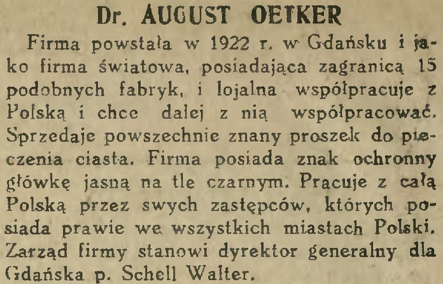 Firma powstała w 1922 r. w Gdańsku i jako firma światowa, posiadająca zagranicą 15 podobnych fabryk, i lojalna współpracuje z Polską i chce dalej z nią współpracować. Sprzedaje powszechnie znany proszek do pieczenia ciasta. Firma posiada znak ochronny główkę jasną na tle czarnym. Pracuje z całą Polską przez swych zastępców, których posiada prawie we wszystkich miastach Polski. Zarząd firmy stanowi dyrektor generalny dla Gdańska p. Schell Walter.