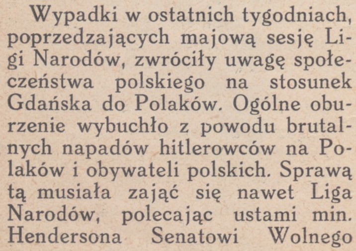 Wypadki w ostatnich tygodniach, poprzedzających majową sesję Ligi Narodów, zwróciły uwagę społeczeństwa polskiego na stosunek Gdańska do Polaków. Ogólne oburzenie wybuchło z powodu brutalnych napadów hitlerowców na Polaków i obywateli polskich. Sprawą tą musiała zająć się nawet Liga Narodów, polecając ustami min. Hendersona Senatowi Wolnego Miasta ukrócenie tego rozwydrzenia.