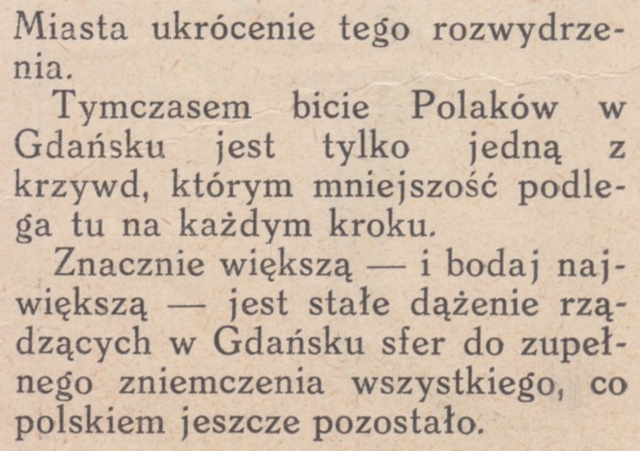 Znacznie większą – i bodaj największą – jest stałe dążenie rządzących w Gdańsku sfer do zupełnego zniemczenia wszystkiego, co polskiem jeszcze pozostało.