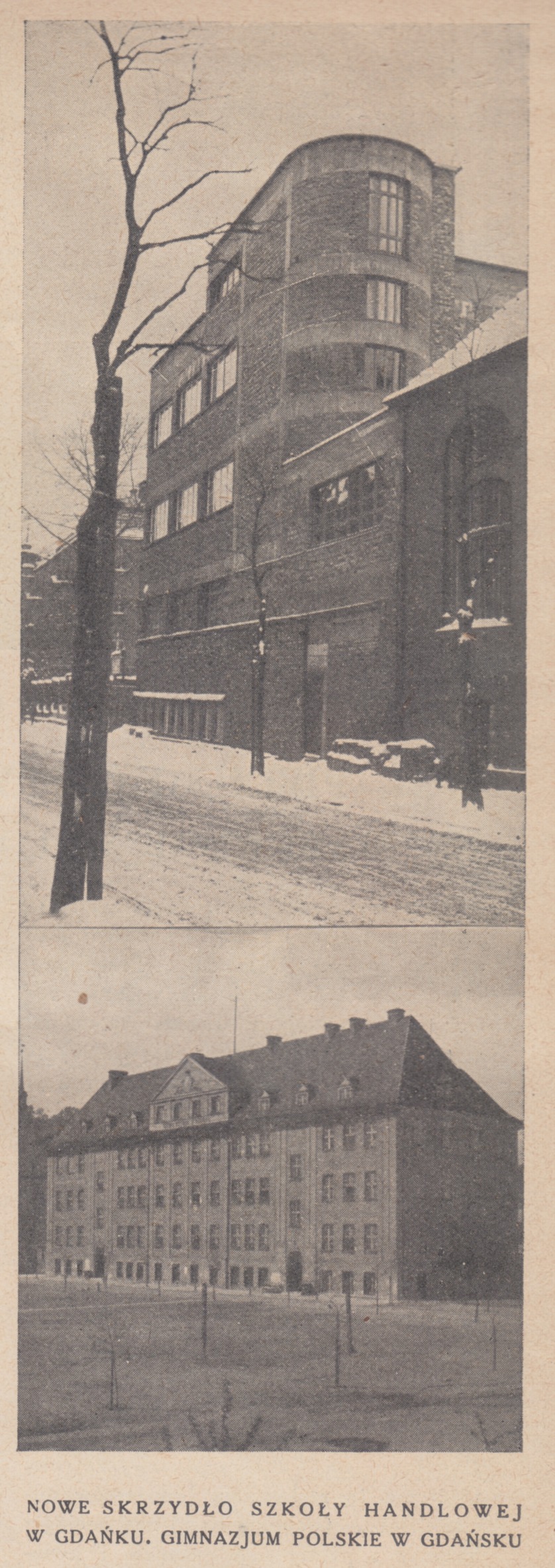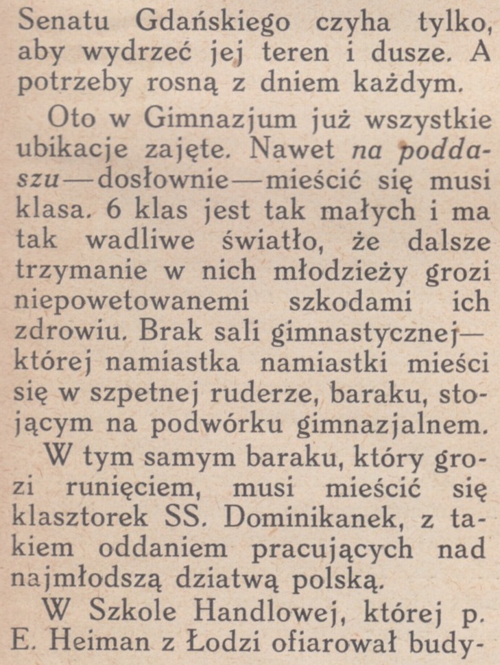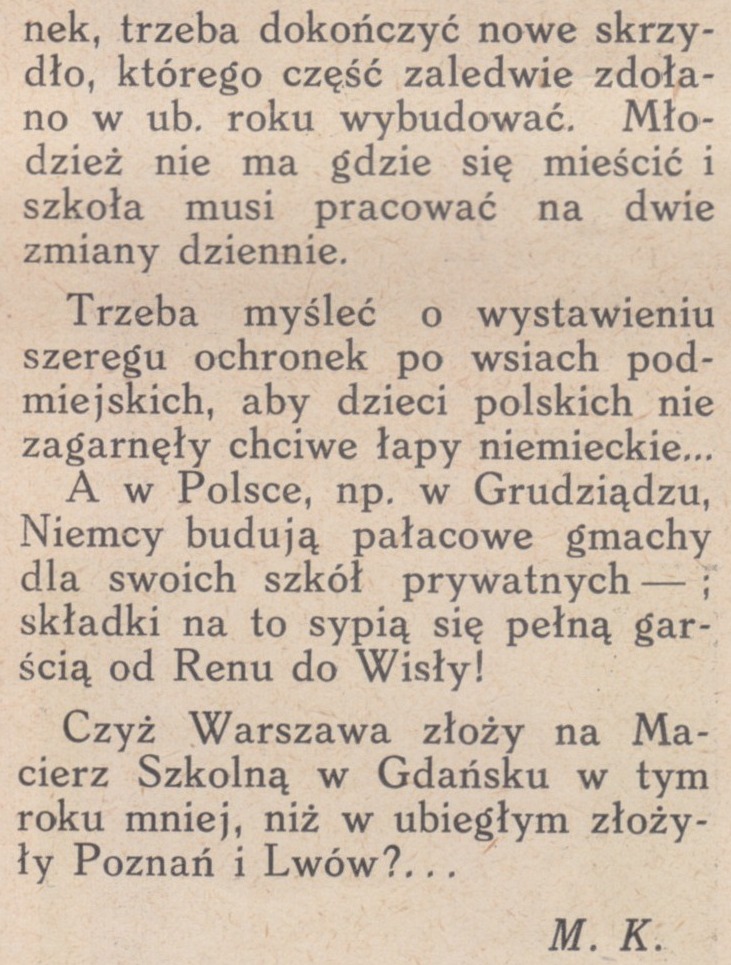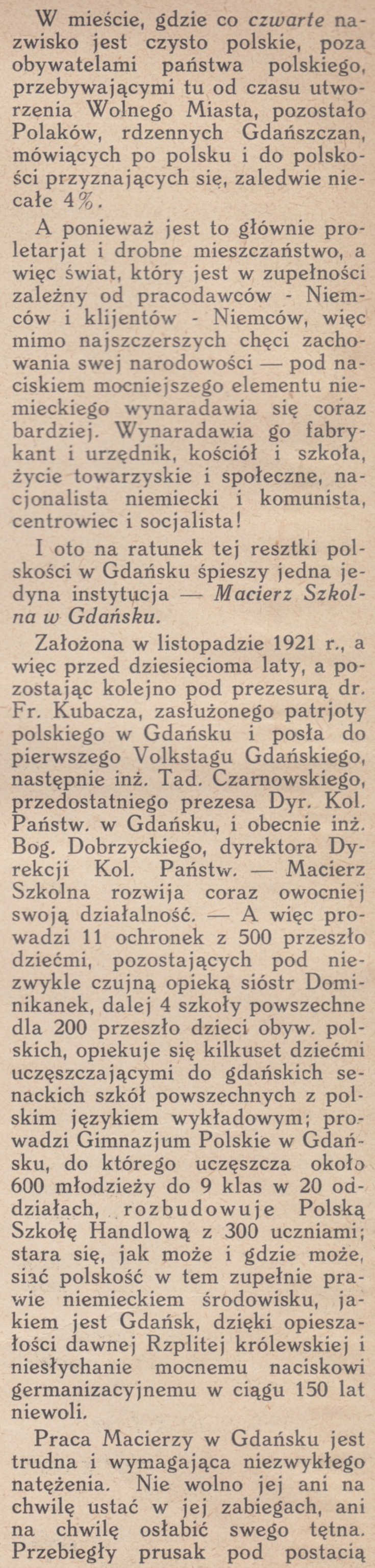 Założona w listopadzie 1921 r., a więc przed dziesięcioma laty, a pozostając kolejno pod prezesurą dr. Fr. Kubacza, zasłużonego patrjoty polskiego w Gdańsku i posła do pierwszego Volkstagu Gdańskiego, następnie inż. Tad. Czarnowskiego, przedostatniego prezesa Dyr. Kol. Państw. w Gdańsku, i obecnie inż. Bog. Dobrzyckiego, dyrektora Dyrekcji Kol. Państw. – Macierz Szkolna rozwija coraz owocniej swoją działalność. – A więc prowadzi 11 ochronek z 500 przeszło dziećmi, pozostających pod niezwykle czujną opieką sióstr Dominikanek, dalej 4 szkoły powszechne dla 200 przeszło dzieci obyw. polskich, opiekuje się kilkuset dziećmi uczęszczającymi do gdańskich senackich szkół powszechnych z polskim językiem wykładowym; prowadzi Gimnazjum Polskie w Gdańsku, do którego uczęszcza około 600 młodzieży do 9 klas w 20 oddziałach, rozbudowuje Polską Szkołę Handlową z 300 uczniami; stara się, jak może i gdzie może, siać polskość w tem zupełnie prawie niemieckiem środowisku, jakiem jest Gdańsk, dzięki opieszałości dawnej Rzplitej królewskiej i niesłychanie mocnemu naciskowi germanizacyjnemu w ciągu 150 lat niewoli.
