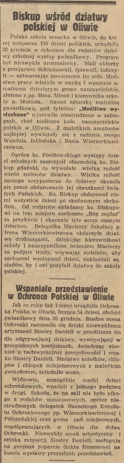 Polska szkoła senacka w Oliwie [ul. Cystersów 15 - spalona 25. marca 1945 r.], do której uczęszcza 150 dzieci polskich, urządziła 20 grudnia w ochronce [ul. Czyżewskiego 12] dla rodziców dziatwy szkolnej występ gwiazdkowy. Program był niezwykle urozmaicony. Mali aktorzy z przejęciem deklamowali. śpiewali, tańczyli - odtwarzając powierzone im role. Mnóstwo pracy włożyło w na naukę i wpajanie amatorom dziecięcym grono nauczycielskie, złożone z pp. Mosa. Mirau i kierownika szkoły p. Muzioła. Nawet sztuczkę teatralną gwiazdkową pod tytułem "Modlitwa wysłuchana" wystawiło niestrudzone w zabiegach, choć nieliczne koło nauczycielskie polskie w Oliwie. Z maleńkich amatorów najlepiej wywiązały się z zadania swego Wandzia Jabłońska i Basia Wieczorkiewiczówna.