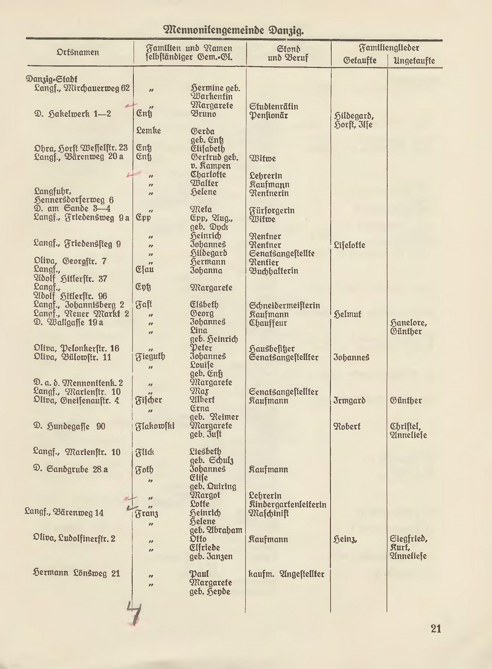 | Lessingstraße 21 | Dyck Meta geb. Dyck | | | | 20 |