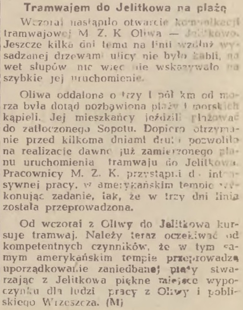 Oliwa oddalona o trzy i pół km od morza była dotąd pozbawiona plaży i morskich kąpieli. Jej mieszkańcy jeździli plażować do zatłoczonego Sopotu. Dopiero otrzymanie przed kilkoma dniami drutu pozwoliło na realizację dawno już zamierzonego plan nu uruchomienia tramwaju do Jelitkowa. Pracownicy M. Z. K. przystąpili do intensywnej pracy. W amerykańskim tempie wykonując zadanie, tak, że w trzy dni linia została przeprowadzona.