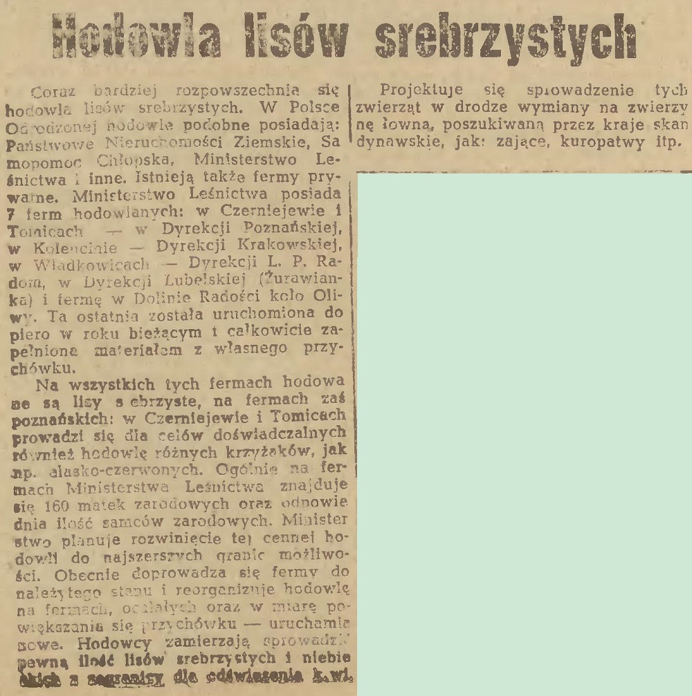 Coraz bardziej rozpowszechnia się hodowla lisów srebrzystych. W Polsce Odrodzonej hodowle podobne posiadają: Państwowe Nieruchomości Ziemskie, Samopomoc Chłopska, Ministerstwo Leśnictwa i inne. Istnieją także fermy prywatne. Ministerstwo Leśnictwa posiada 7 ferm hodowlanych: w Czerniejewie i Tomicach - w Dyrekcji Poznańskiej, w Kolencinie - Dyrekcji Krakowskiej, w Władkowicach - Dyrekcji L. P. Radom, w Dyrekcji Lubelskiej (Żurawianka) i fermę w Dolinie Radości koło Oliwy. Ta ostatnia została uruchomiona dopiero w roku bieżącym i całkowicie zapełniona materiałem z własnego przychówku.