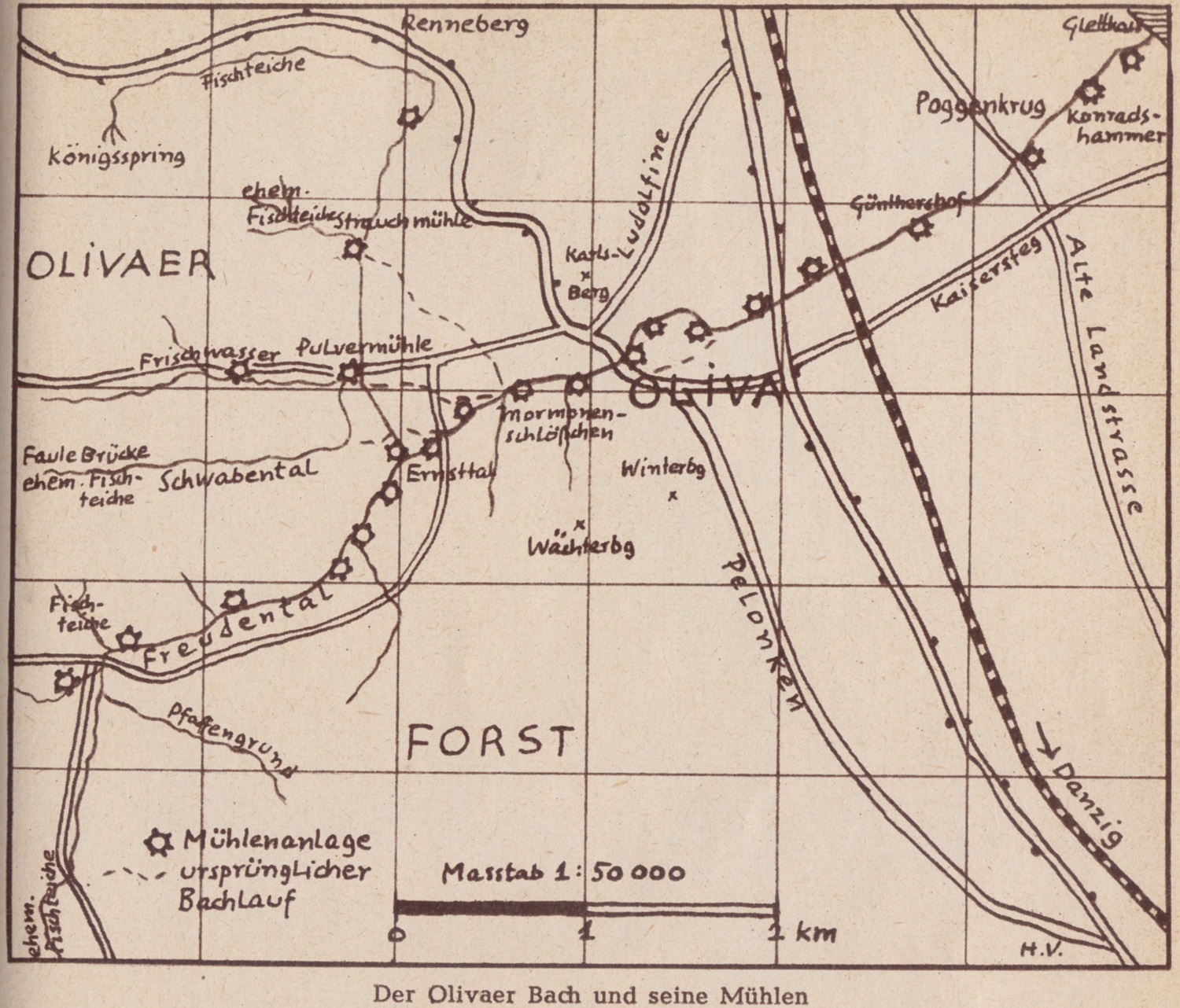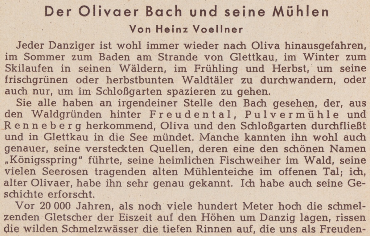 Jeder Danziger ist wohl immer wieder nach Oliva hinausgefahren, im Sommer zum Baden am Strande von Glettkau, im Winter zum Skilaufen in seinen Wäldern, im Frühling und Herbst, um seine frischgrünen oder herbstbunten Waldtäler zu durchwandern, oder auch nur, um im Schloßgarten spazieren zu gehen. Sie alle haben an irgendeiner Stelle den Bach gesehen, der, aus den Waldgründen hinter Freudental, Pulvermühle und Renneberg herkommend, Oliva und den Schloßgarten durchfließt und in Glettkau in die See mündet. Manche kannten ihn wohl auch genauer, seine versteckten Quellen, deren eine den schönen Namen „Königsspring" führte, seine heimlichen Fischweiher im Wald, seine vielen Seerosen tragenden alten Mühlenteiche im offenen Tal; ich, alter Olivaer, habe ihn sehr genau gekannt. Ich habe auch seine Geschichte erforscht. Vor 20 000 Jahren, als noch viele hundert Meter hoch die schmelzenden Gletscher der Eiszeit auf den Höhen um Danzig lagen, rissen die wilden Schmelzwässer die tiefen Rinnen auf, die uns als Freudental,