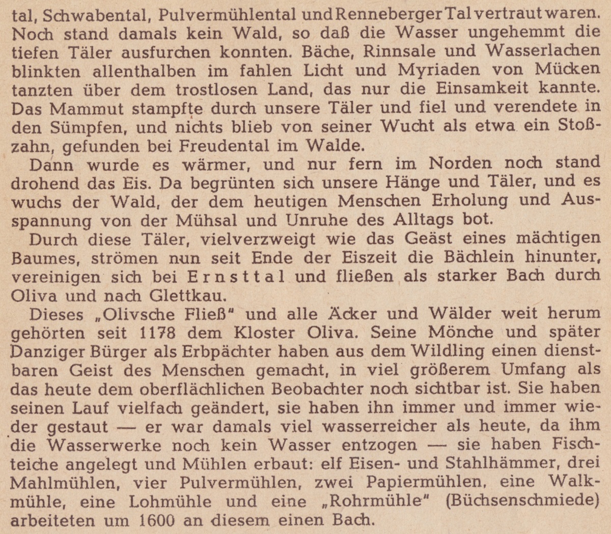 Schwabental, Pulvermühlental und Renneberger Tal vertraut waren. Noch stand damals kein Wald, so daß die Wasser ungehemmt die tiefen Täler ausfurchen konnten. Bäche, Rinnsale und Wasserlachen blinkten allenthalben im fahlen Licht und Myriaden von Mücken tanzten über dem trostlosen Land, das nur die Einsamkeit kannte. Das Mammut stampfte durch unsere Täler und fiel und verendete in den Sümpfen, und nichts blieb von seiner Wucht als etwa ein Stoßzahn, gefunden bei Freudental im Walde. Dann wurde es wärmer, und nur fern im Norden noch stand drohend das Eis. Da begrünten sich unsere Hänge und Täler, und es wuchs der Wald, der dem heutigen Menschen Erholung und Ausspannung von der Mühsal und Unruhe des Alltags bot. Durch diese Täler, vielverzweigt wie das Geäst eines mächtigen Baumes, strömen nun seit Ende der Eiszeit die Bächlein hinunter, vereinigen sich bei Ernsttal und fließen als starker Bach durch Oliva und nach Glettkau. Dieses "Olivsche Fließ" und alle Äcker und Wälder weit herum gehörten seit 1178 dem Kloster Oliva. Seine Mönche und später Danziger Bürger als Erbpächter haben aus dem Wildling einen dienstbaren Geist des Menschen gemacht, in viel größerem Umfang als das heute dem oberflächlichen Beobachter noch sichtbar ist. Sie haben seinen Lauf vielfach geändert, sie haben ihn immer und immer wieder gestaut - er war damals viel wasserreicher als heute, da ihm die Wasserwerke noch kein Wasser entzogen - sie haben Fischteiche angelegt und Mühlen erbaut: elf Eisen- und Stahlhämmer, drei Mahlmühlen, vier Pulvermühlen, zwei Papiermühlen, eine Walkmühle, eine Lohmühle und eine "Rohrmühle" (Büchsenschmiede) arbeiteten um 1600 an diesem einen Bach.
