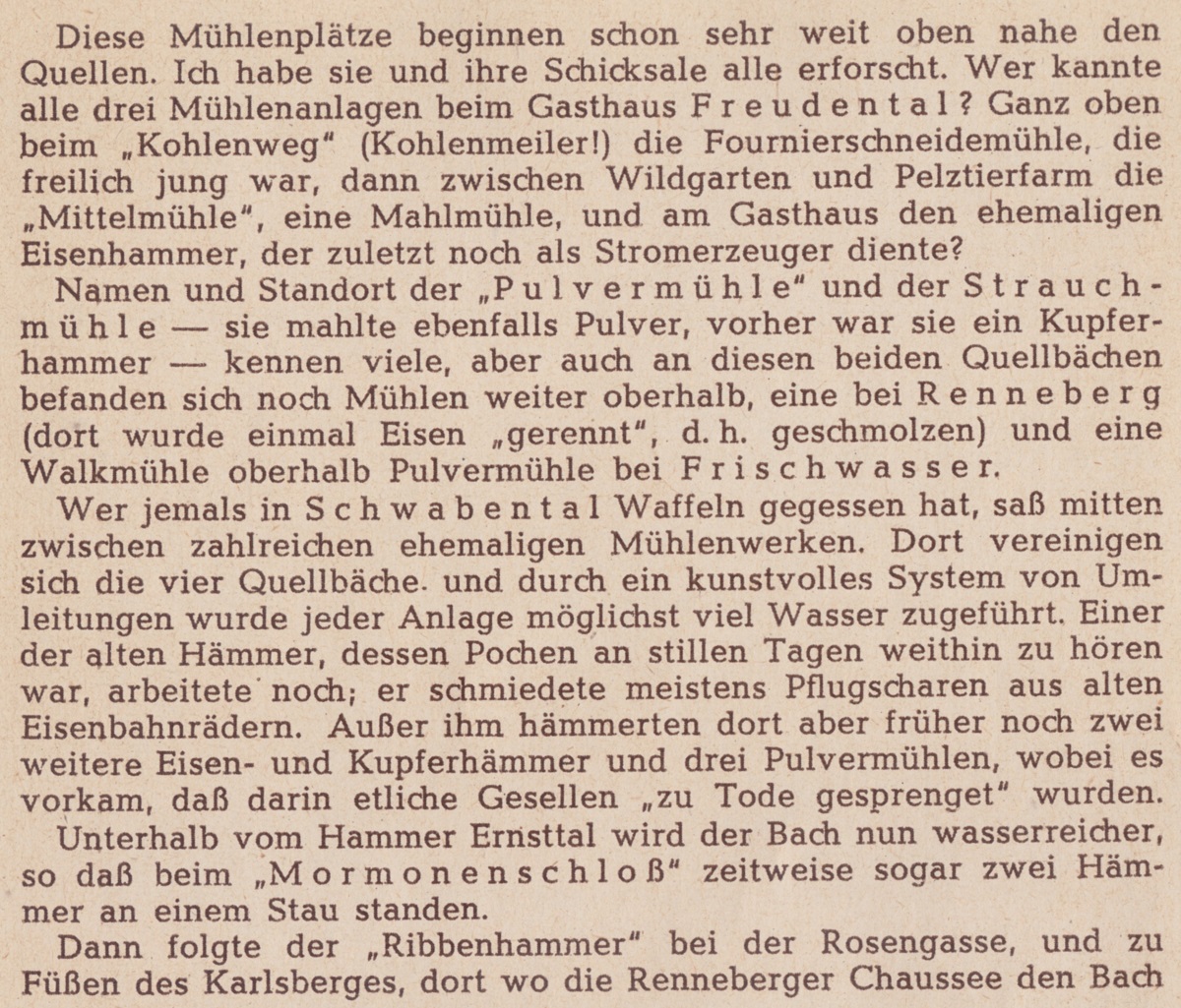 Diese Mühlenplätze beginnen schon sehr weit oben nahe den Quellen. Ich habe sie und ihre Schicksale alle erforscht. Wer kannte alle drei Mühlenanlagen beim Gasthaus Freudental? Ganz oben beim "Kohlenweg" (Kohlenmeiler!) die Fournierschneidemühle, die freilich jung war, dann zwischen Wildgarten und Pelztierfarm die "Mittelmühle", eine Mahlmühle, und am Gasthaus den ehemaligen Eisenhammer, der zuletzt noch als Stromerzeuger diente? Namen und Standort der "Pulvermühle" und der Strauchmühle sie mahlte ebenfalls Pulver, vorher war sie ein Kupferhammer kennen viele, aber auch an diesen beiden Quellbächen befanden sich noch Mühlen weiter oberhalb, eine bei Renneberg (dort wurde einmal Eisen "gerennt", d. h. geschmolzen) und eine Walkmühle oberhalb Pulvermühle bei Frischwasser. Wer jemals in Schwabental Waffeln gegessen hat, saß mitten zwischen zahlreichen ehemaligen Mühlenwerken. Dort vereinigen sich die vier Quellbäche und durch ein kunstvolles System von Umleitungen wurde jeder Anlage möglichst viel Wasser zugeführt. Einer der alten Hämmer, dessen Pochen an stillen Tagen weithin zu hören war, arbeitete noch; er schmiedete meistens Pflugscharen aus alten Eisenbahnrädern. Außer ihm hämmerten dort aber früher noch zwei weitere Eisen- und Kupferhämmer und drei Pulvermühlen, wobei es vorkam, daß darin etliche Gesellen "zu Tode gesprenget" wurden. Unterhalb vom Hammer Ernsttal wird der Bach nun wasserreicher, so daß beim "Mormonenschloß" zeitweise sogar zwei Hämmer an einem Stau standen. Dann folgte der "Ribbenhammer" bei der Rosengasse, und zu Füßen des Karlsberges, dort wo die Renneberger Chaussee den Bach