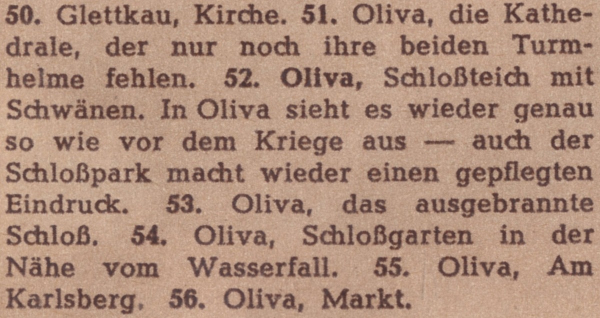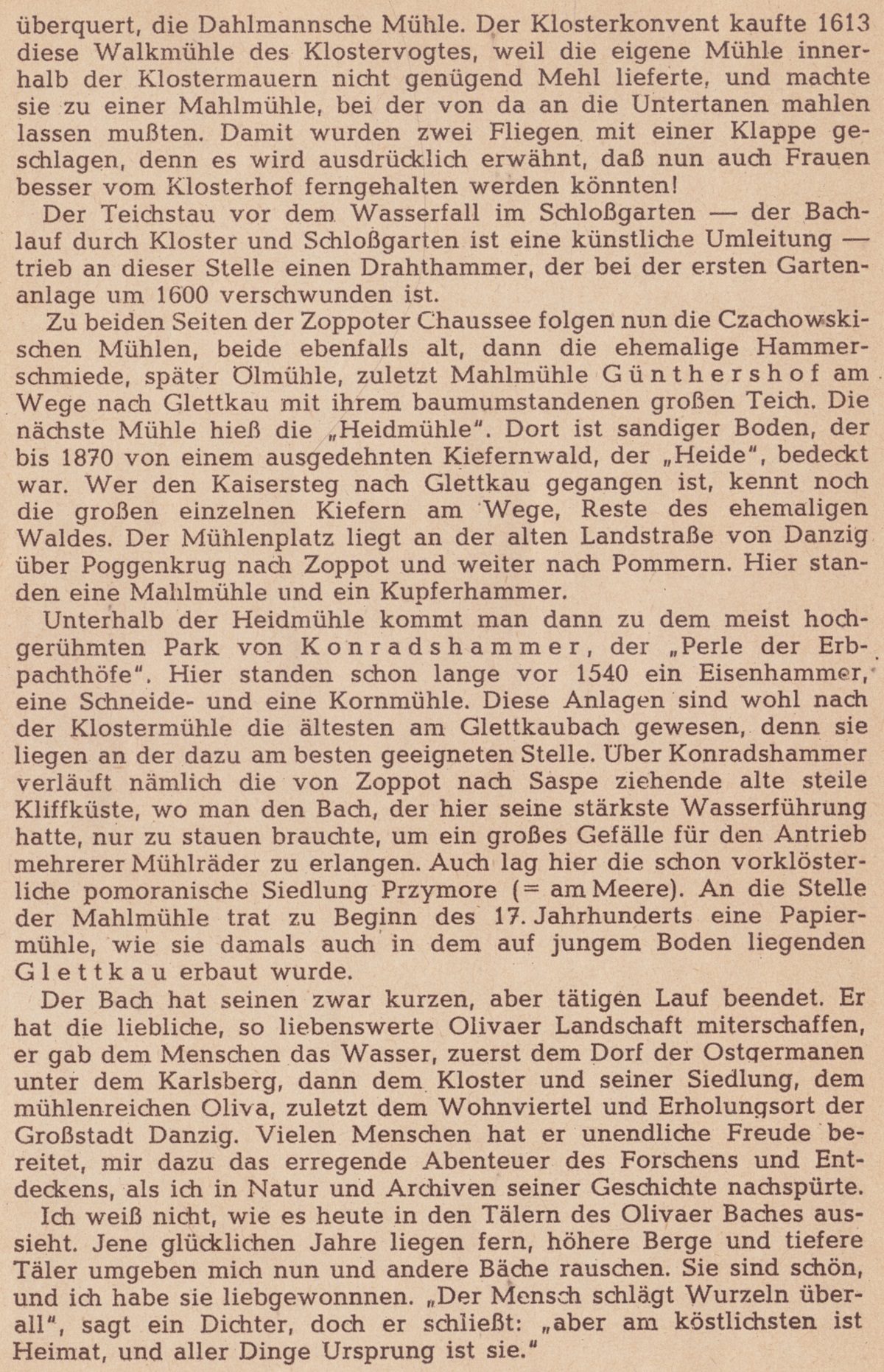 überquert, die Dahlmannsche Mühle. Der Klosterkonvent kaufte 1613 diese Walkmühle des Klostervogtes, weil die eigene Mühle inner- halb der Klostermauern nicht genügend Mehl lieferte, und machte sie zu einer Mahlmühle, bei der von da an die Untertanen mahlen lassen mußten. Damit wurden zwei Fliegen mit einer Klappe geschlagen, denn es wird ausdrücklich erwähnt, daß nun auch Frauen besser vom Klosterhof ferngehalten werden könnten! Der Teichstau vor dem Wasserfall im Schloßgarten - der Bachlauf durch Kloster und Schloßgarten ist eine künstliche Umleitung - trieb an dieser Stelle einen Drahthammer, der bei der ersten Gartenanlage um 1600 verschwunden ist. Zu beiden Seiten der Zoppoter Chaussee folgen nun die Czachowskischen Mühlen, beide ebenfalls alt, dann die ehemalige Hammerschmiede, später Ölmühle, zuletzt Mahlmühle Günthershof am Wege nach Glettkau mit ihrem baumumstandenen großen Teich. Die nächste Mühle hieß die "Heidmühle". Dort ist sandiger Boden, der bis 1870 von einem ausgedehnten Kiefernwald, der "Heide", bedeckt war. Wer den Kaisersteg nach Glettkau gegangen ist, kennt noch die großen einzelnen Kiefern am Wege, Reste des ehemaligen Waldes. Der Mühlenplatz liegt an der alten Landstraße von Danzig über Poggenkrug nach Zoppot und weiter nach Pommern. Hier standen eine Mahlmühle und ein Kupferhammer. Unterhalb der Heidmühle kommt man dann zu dem meist hochgerühmten Park von Konradshammer, der "Perle der Erbpachthöfe". Hier standen schon lange vor 1540 ein Eisenhammer, eine Schneide- und eine Kornmühle. Diese Anlagen sind wohl nach der Klostermühle die ältesten am Glettkaubach gewesen, denn sie liegen an der dazu am besten geeigneten Stelle. Über Konradshammer verläuft nämlich die von Zoppot nach Saspe ziehende alte steile Kliffküste, wo man den Bach, der hier seine stärkste Wasserführung hatte, nur zu stauen brauchte, um ein großes Gefälle für den Antrieb mehrerer Mühlräder zu erlangen. Auch lag hier die schon vorklösterliche pomoranische Siedlung Przymore (= am Meere). An die Stelle der Mahlmühle trat zu Beginn des 17. Jahrhunderts eine Papiermühle, wie sie damals auch in dem auf jungem Boden liegenden Glettkau erbaut wurde. Der Bach hat seinen zwar kurzen, aber tätigen Lauf beendet. Er hat die liebliche, so liebenswerte Olivaer Landschaft miterschaffen, er gab dem Menschen das Wasser, zuerst dem Dorf der Ostgermanen unter dem Karlsberg, dann dem Kloster und seiner Siedlung, dem mühlenreichen Oliva, zuletzt dem Wohnviertel und Erholungsort der Großstadt Danzig. Vielen Menschen hat er unendliche Freude bereitet, mir dazu das erregende Abenteuer des Forschens und Entdeckens, als ich in Natur und Archiven seiner Geschichte nachspürte. Ich weiß nicht, wie es heute in den Tälern des Olivaer Baches aussieht. Jene glücklichen Jahre liegen fern, höhere Berge und tiefere Täler umgeben mich nun und andere Bäche rauschen. Sie sind schön, und ich habe sie liebgewonnnen. "Der Mensch schlägt Wurzeln überall", sagt ein Dichter, doch er schließt: "aber am köstlichsten ist Heimat, und aller Dinge Ursprung ist sie."