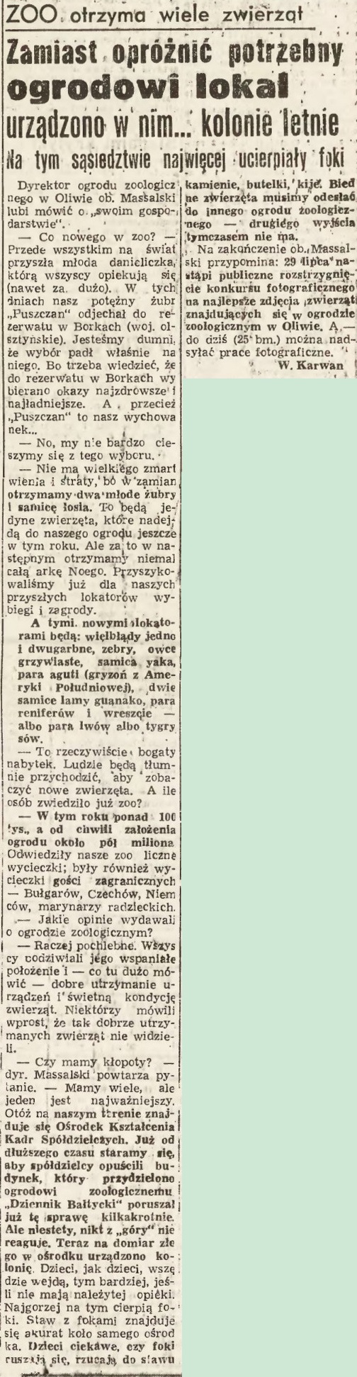 Kolonie letnie w ZOO ›![]() Dziennik Bałtycki z 25. lipca 1956 roku: "Zamiast opróżnić potrzebny ogrodowi lokal urządzono w min... kolonie letnie" - Czy mamy kłopoty? - dyr. Massalski powtarza pytanie. - Mamy wiele, ale jeden jest najważniejszy. Otóż na naszym terenie znajduje się Ośrodek Kształcenia Kadr Spółdzielczych. Już od dłuższego czasu staramy się, aby spółdzielcy opuścili budynek, który przydzielono ogrodowi zoologicznemu. "Dziennik Bałtycki" poruszał już tę sprawę kilkakrotnie. Ale niestety nikt z "góry" nie reaguje. Teraz na domiar złego w ośrodku urządzono kolonię. Dzieci, jak dzieci, wszędzie wejdą, tym bardziej, jeśli nie mają należytej opieki. Najgorzej na tym cierpią foki znajdujące się akurat koło samego ośrodka. Dzieci ciekawe czy foki ruszają się, rzucają do stawu kamienie, butelki, kije. Biedne zwierzęta musimy odesłać do innego ogrodu zoologicznego - drugiego wyjścia tymczasem nie ma.