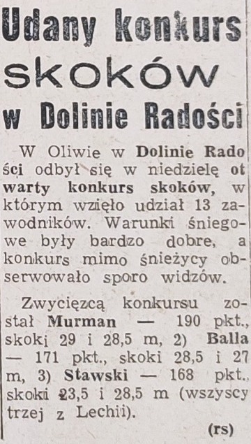 W Oliwie w Dolinie Radości odbył się w niedzielę otwarty konkurs skoków, w którym wzięło udział 13 zawodników. Warunki śniegowe były bardzo dobre, a konkurs mimo śnieżycy obserwowało sporo widzów.