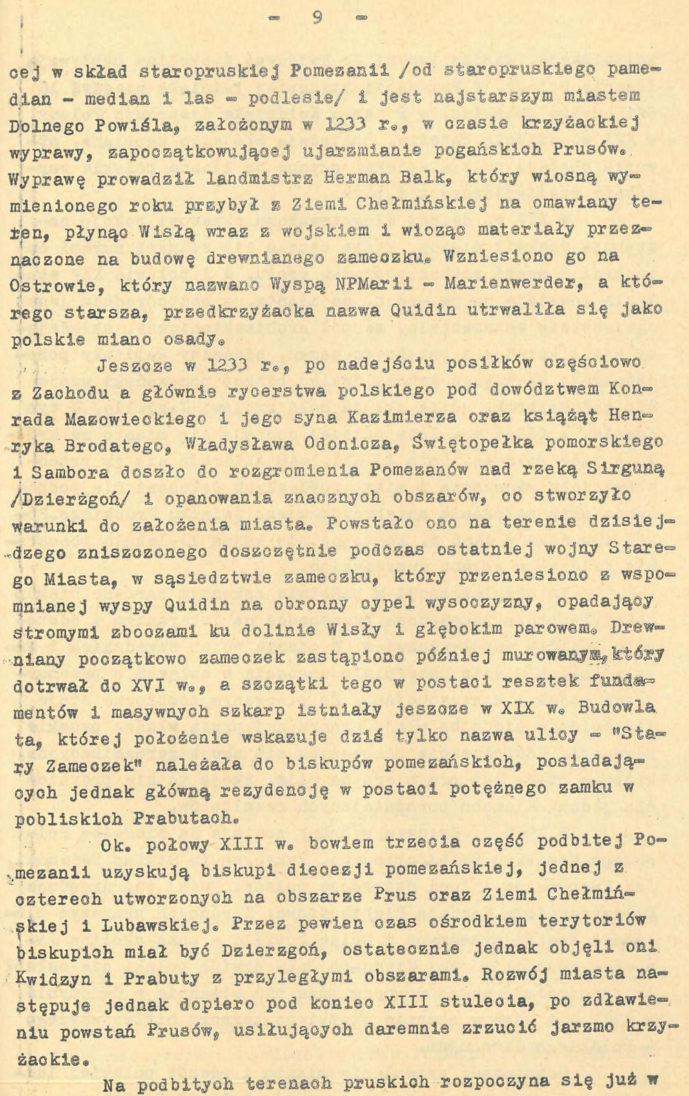 Jeszcze w 1233 r., po nadejściu posiłków częściowo, z Zachodu a głównie rycerstwa polskiego pod dowództwem Konrada Mazowieckiego i jego syna Kazimierza oraz książąt Henryka Brodatego, Władysława Odonicza, Świętopełka pomorskiego i Sambora doszło do rozgromienia Pomezanów nad rzeką Sirguną /Dzierzgoń/ i opanowania znacznych obszarów, co stworzyło warunki do założenia miasta. Powstało ono na terenie dzisiejszego zniszczonego doszczętnie podczas ostatniej wojny Starego Miasta, w sąsiedztwie zameczku, który przeniesiono z wspomnianej wyspy Quidin na obronny cypel wysoczyzny, opadający stromymi zboczami ku dolinie Wisły i głębokim parowem. Drewniany początkowo zameczek zastąpiono później murowanym, który dotrwał do XYI w., a szczątki tego w postaci resztek fundamentów i masywnych skarp istniały jeszcze w XIX w. Budowla, ta, której położenie wskazuje dziś tylko nazwa ulicy - "Stary Zameczek" należała do biskupów pomezańskich, posiadających jednak główną rezydencję w postaci potężnego zamku w pobliskich Prabutach.
