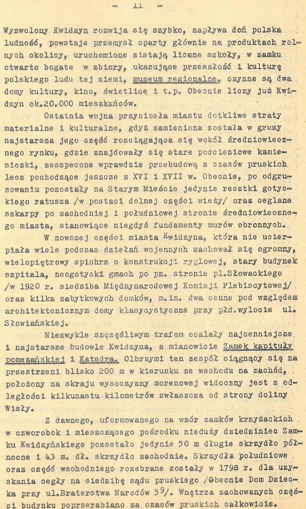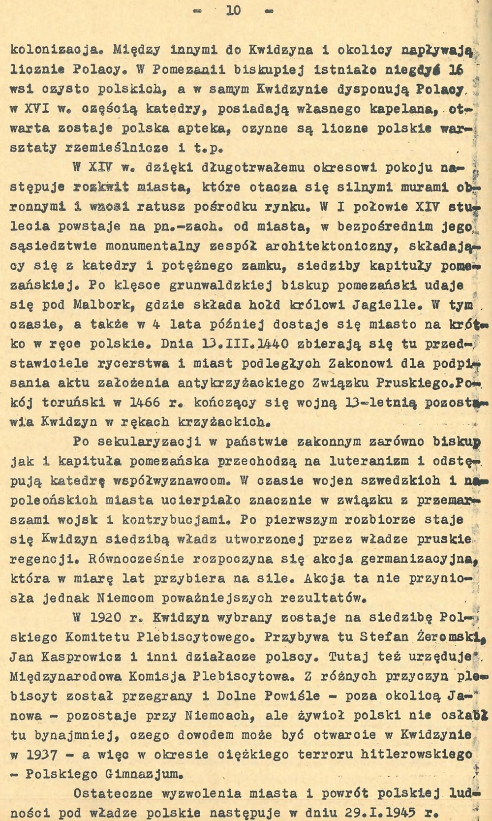 Ostateczne wyzwolenia miasta i powrót polskiej ludności pod władze polskie następuje w dniu 29.I.1945 r. Wyzwolony Kwidzyn rozwija się szybko, napływa doń polska ludność, powstaje przemysł oparty głównie na produktach rolnych okolicy, uruchomione zostają liczne szkoły, w zamku otwarto bogate w zbiory, ukazujące przeszłość i kulturę polskiego ludu tej ziemi, muzeum regionalne, czynne są dwa domy kultury, kino, świetlicę i t.p. Obecnie liczy już Kwidzyń ok.20.000 mieszkańców.
