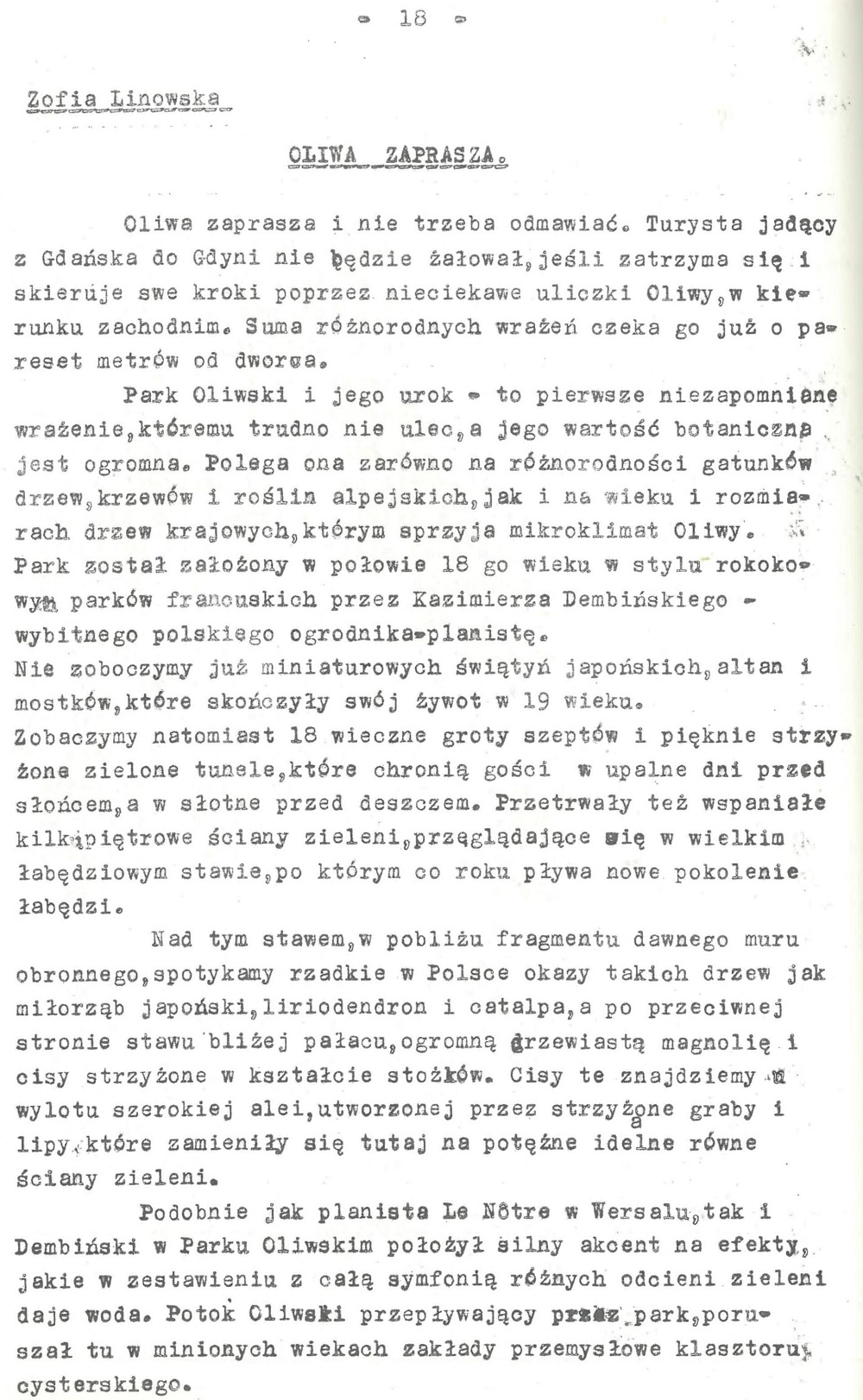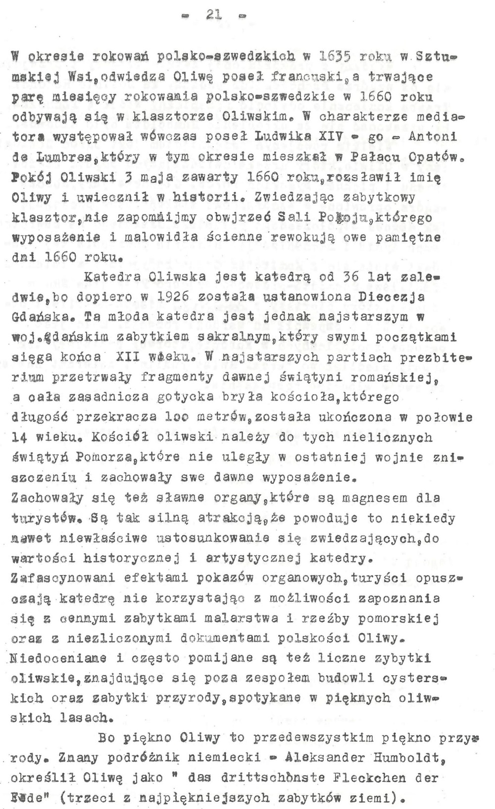 Oliwa zaprasza i nie trzeba odmawiać. Turysta jadący z Gdańska do Gdyni nie będzie żałował, jeśli zatrzyma się i skieruje swe kroki poprzez nieciekawe uliczki Oliwy, w kierunku zachodnim. Suma różnorodnych wrażeń czeka go już o pareset metrów od dworca.