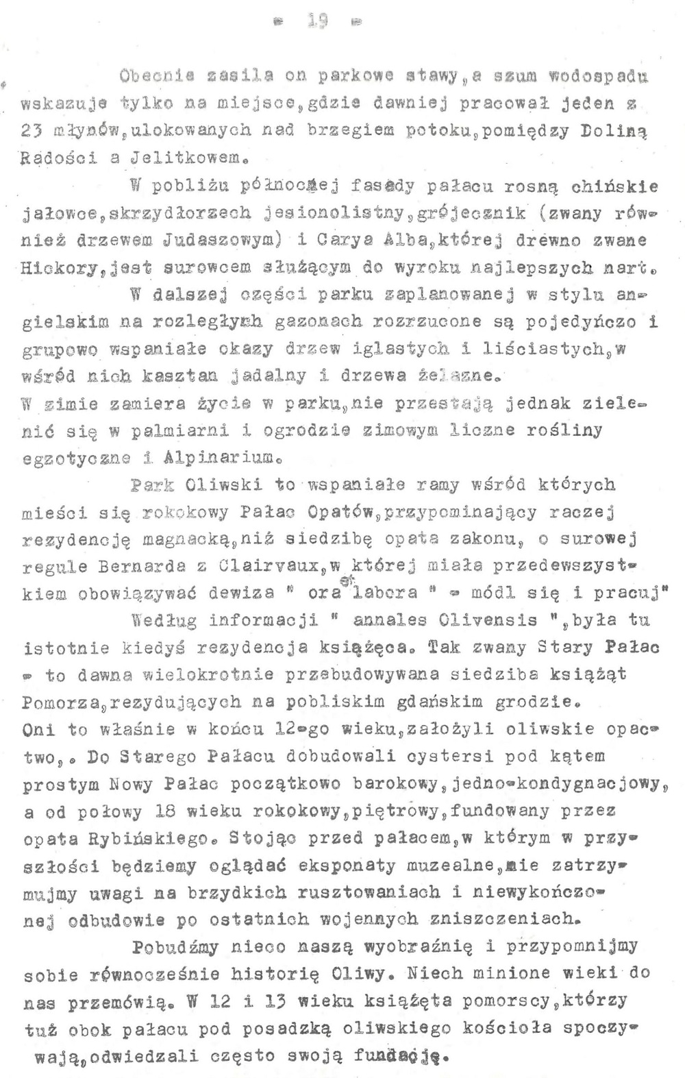 Pobudźmy nieco naszą wyobraźnię i przypomnijmy sobie równocześnie historię Oliwy, Niech minione wieki do nas przemówią. W 12 i 13 wieku książęta pomorscy, którzy tuż obok pałacu pod posadzką oliwskiego kościoła spoczywają, odwiedzali często swoją fundację.