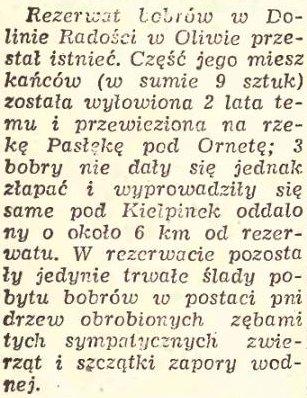 Bóbr uratowany. Pionierem ochrony i restytucji bobra był prof. August Dehmel (1903-62). Z jego to m.in. inicjatywy w 1948 r. w zamian za żubry otrzymaliśmy 12 bobrów z ZSRR. Umieszczone w warszawskim ZOO nadmiernie stłoczone dotkliwie się pocięły i tylko dwa ocalały, przeniesione potem do utworzonego dla nich rezerwatu w Dolinie radosnej w Oliwie. W 1949 r. wpuszczono 4 pary bobrów do fosy na terenie d. fortów w Osowcu nad Biebrzą.
