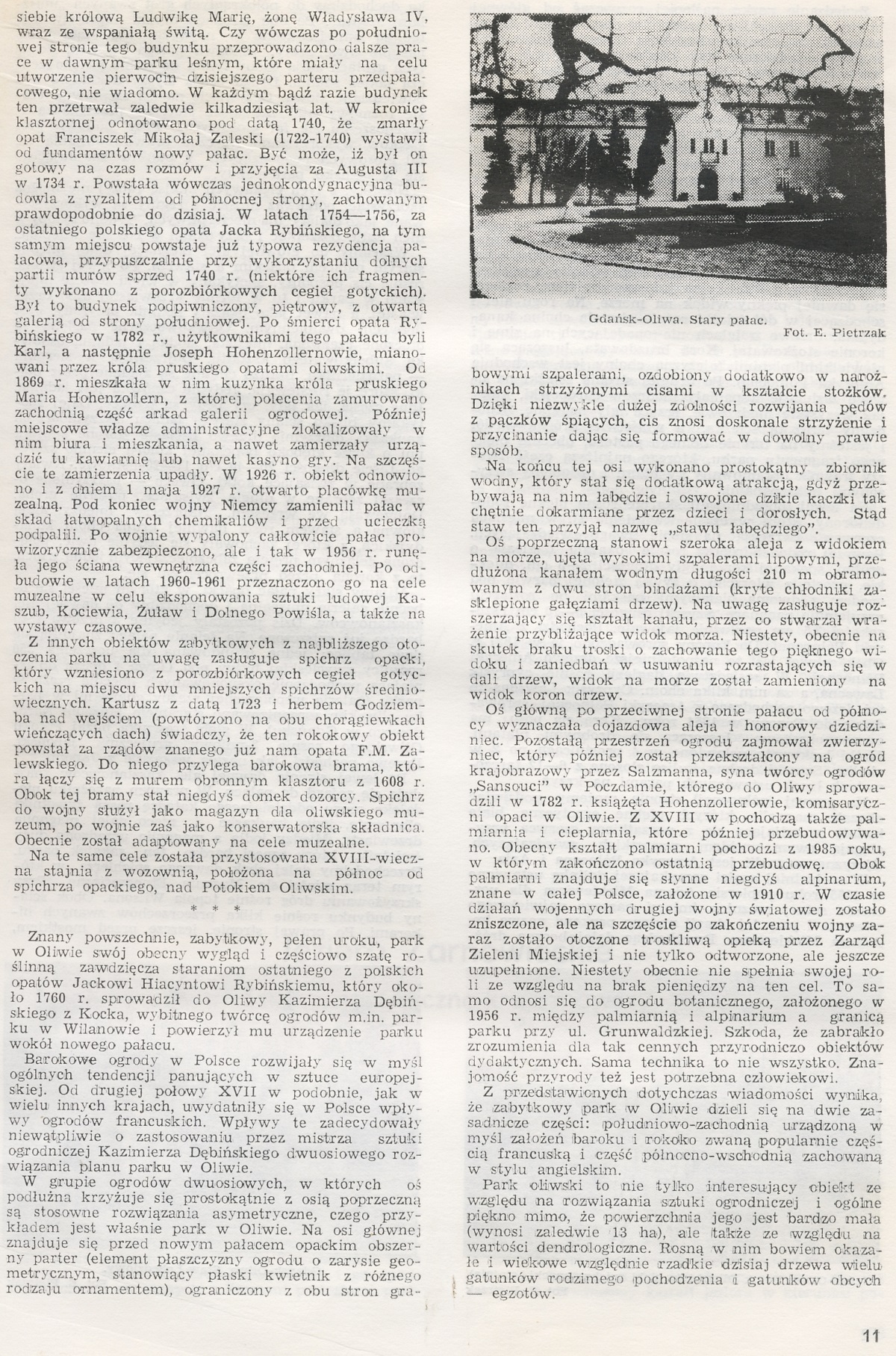 Oś główną po przeciwnej stronie pałacu od północy wyznaczała dojazdowa aleja i honorowy dziedziniec. Pozostałą przestrzeń ogrodu zajmował zwierzyniec, który później został przekształcony na ogród krajobrazowy przez Salzmanna, syna twórcy ogrodów "Sansouci" w Poczdamie, którego do Oliwy sprowadzili w 1782 r. książęta Hohenzollerowie, komisaryczni opaci w Oliwie. Z XVIII w pochodzą także palmiarnia i cieplarnia, które później przebudowywano. Obecny kształt palmiarni pochodzi z 1985 roku, w którym zakończono ostatnią przebudowę. Obok palmiarni znajduje się słynne niegdyś alpinarium, znane w całej Polsce, założone w 1910 r. W czasie działań wojennych drugiej wojny światowej zostało zniszczone, ale na szczęście po zakończeniu wojny zaraz zostało otoczone troskliwą opieką przez Zarząd Zieleni Miejskiej i nie tylko odtworzone, ale jeszcze uzupełnione. Niestety obecnie nie spełnia swojej roli ze względu na brak pieniędzy na ten cel. To samo odnosi się do ogrodu botanicznego, założonego w 1956 r. między palmiarnią i alpinarium a granicą parku przy ul. Grunwaldzkiej. Szkoda, że zabrakło zrozumienia dla tak cennych przyrodniczo obiektów dydaktycznych. Sama technika to nie wszystko. Znajomość przyrody też jest potrzebna człowiekowi.