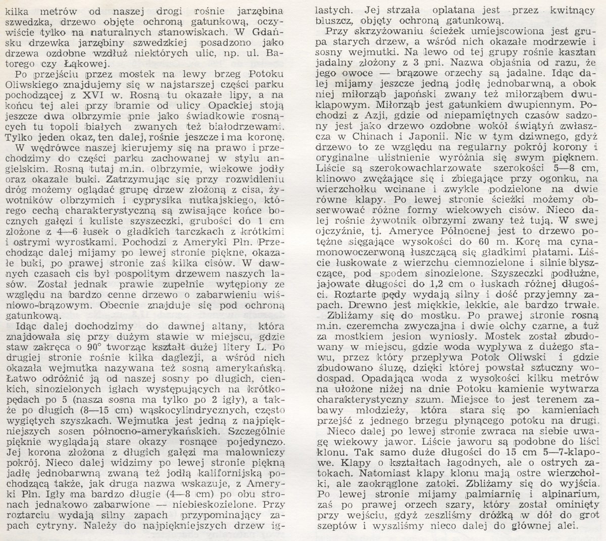 W wędrówce naszej kierujemy się na prawo i przechodzimy do części parku zachowanej w stylu angielskim. Rosną tutaj m.in. olbrzymie, wiekowe jodły oraz okazałe buki. Zatrzymując się przy rozwidleniu dróg możemy oglądać grupę drzew złożoną z cisa, żywotników olbrzymich i cyprysika nutkajskiego, którego cechą charakterystyczną są zwisające końce bocznych gałęzi i kuliste szyszeczki, grubości do 1 cm złożone z 4-6 łusek o gładkich tarczkach z krótkimi i ostrymi wyrostkami. Pochodzi z Ameryki Płn. Przechodząc dalej mijamy po lewej stronie piękne, okazałe buki, po prawej stronie zaś kilka cisów. W dawnych czasach cis był pospolitym drzewem naszych lasów. Został jednak prawie zupełnie wytępiony ze względu na bardzo cenne drzewo o zabarwieniu wiśniowo-brązowym. Obecnie znajduje się pod ochroną gatunkową.