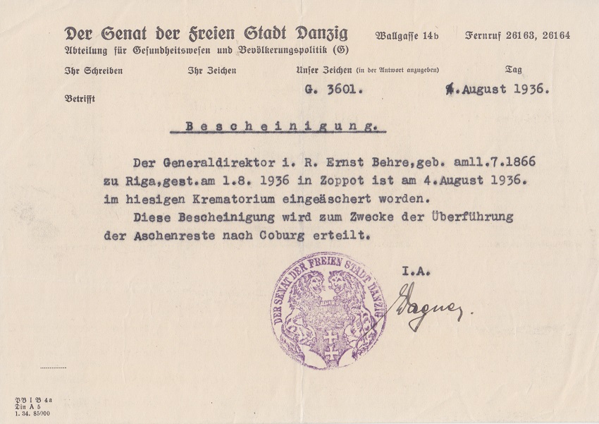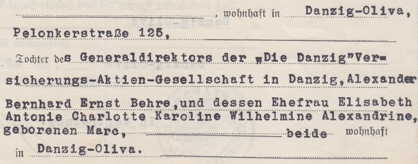 Ernst Behre, dyrektor generalny Ubezpieczalni spółki akcyjnej w Gdańsku. Urodził się 26 czerwca 1866r w Rydze jako syn wydawcy książek w tym mieście. Uczęszczał do gimnazjum w Mitau (obecnie Jelgava) i następnie studiował na fakultecie Historii i Ekonomii Narodowej w Dorpat (obecnie Tartu) w latach 1885-89. W roku 1893 przeprowadził się do Niemiec i pracował w różnych firmach ubezpieczeniowych. W 1903r objął stanowisko generalnego przedstawiciela Petersburskiej Ubezpieczalni Carskiej Rosji z siedzibą w Berlinie