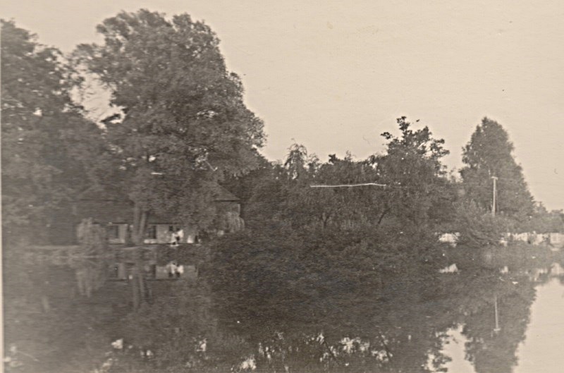 Staw i w głębi po lewej budynek młyna, w którym mieściły się biura zarządu kąpieliska.