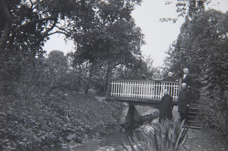 Mostek nad potokiem oliwskim w ogrodzie rodziny Landmann przy ul. Klosterstraße 17 (ul. Cystersów). Fot. z pierwszej dekady XX wieku.