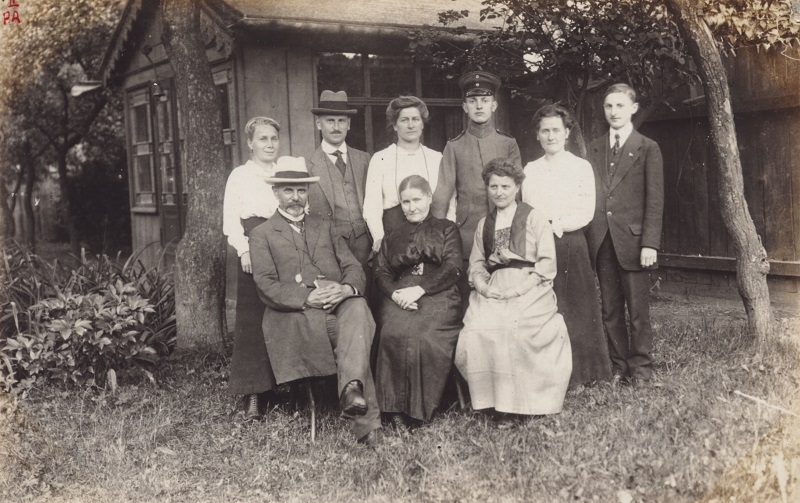 Ogród i pawilon przy obecnej ul. bp. Edmunda Nowickiego. Stoją od lewej: Awi i Leo Gutowski, Agnes Schultheiß, Josef Landmann, Fr. Landmann, Georg Landmann. Siedzą od lewwj: mąż Agnes Schultheiß, Fr. Gutowski z domu Landmann, Hedwig Landmann z domu Grünholz. Lato 1918 roku.