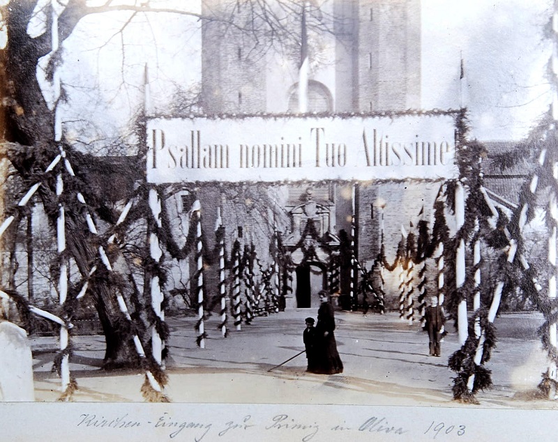 Plac przed fasadą zachodnią katedry oliwskiej (ul. Cystersów) udekorowany z okazji prymicji ks. Józefa Klemensa Landmanna. Mrzec 1903 roku.