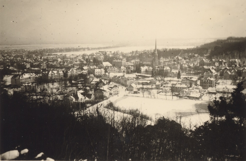 Krajobraz z 6. marca 1949 roku zapewne częściowo uporządkowany, ale jeszcze powojenny, zimowy przedstawia część zniszczeń w centrum Oliwy.