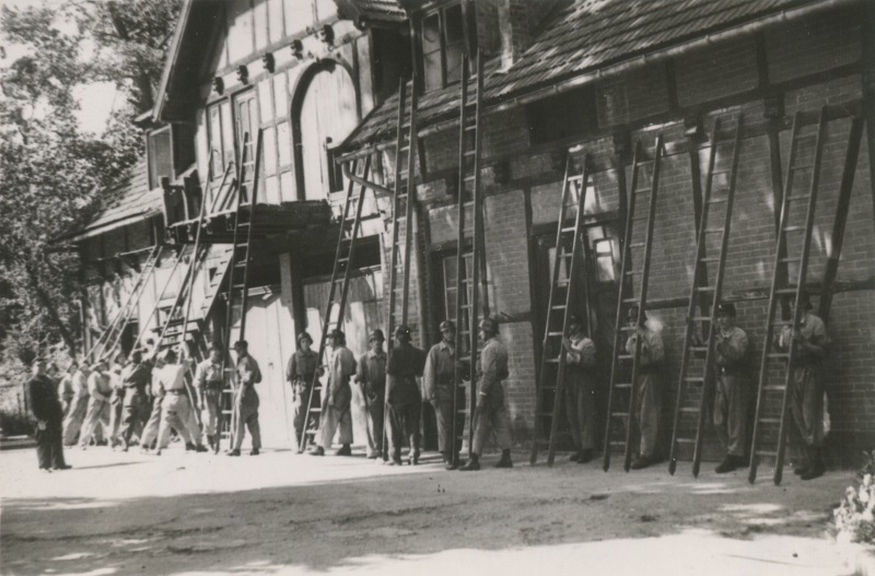 Fotografia wykonana 8. października 1949 roku przedstawia ćwiczenia oliwskiej straży pożarnej i w głębi budynek przy al. Grunwaldzkiej 516a.